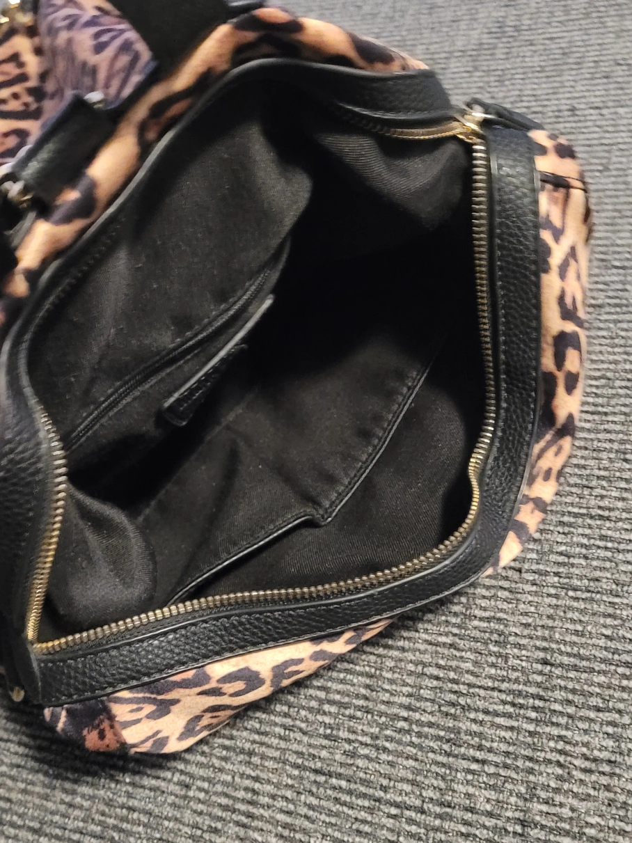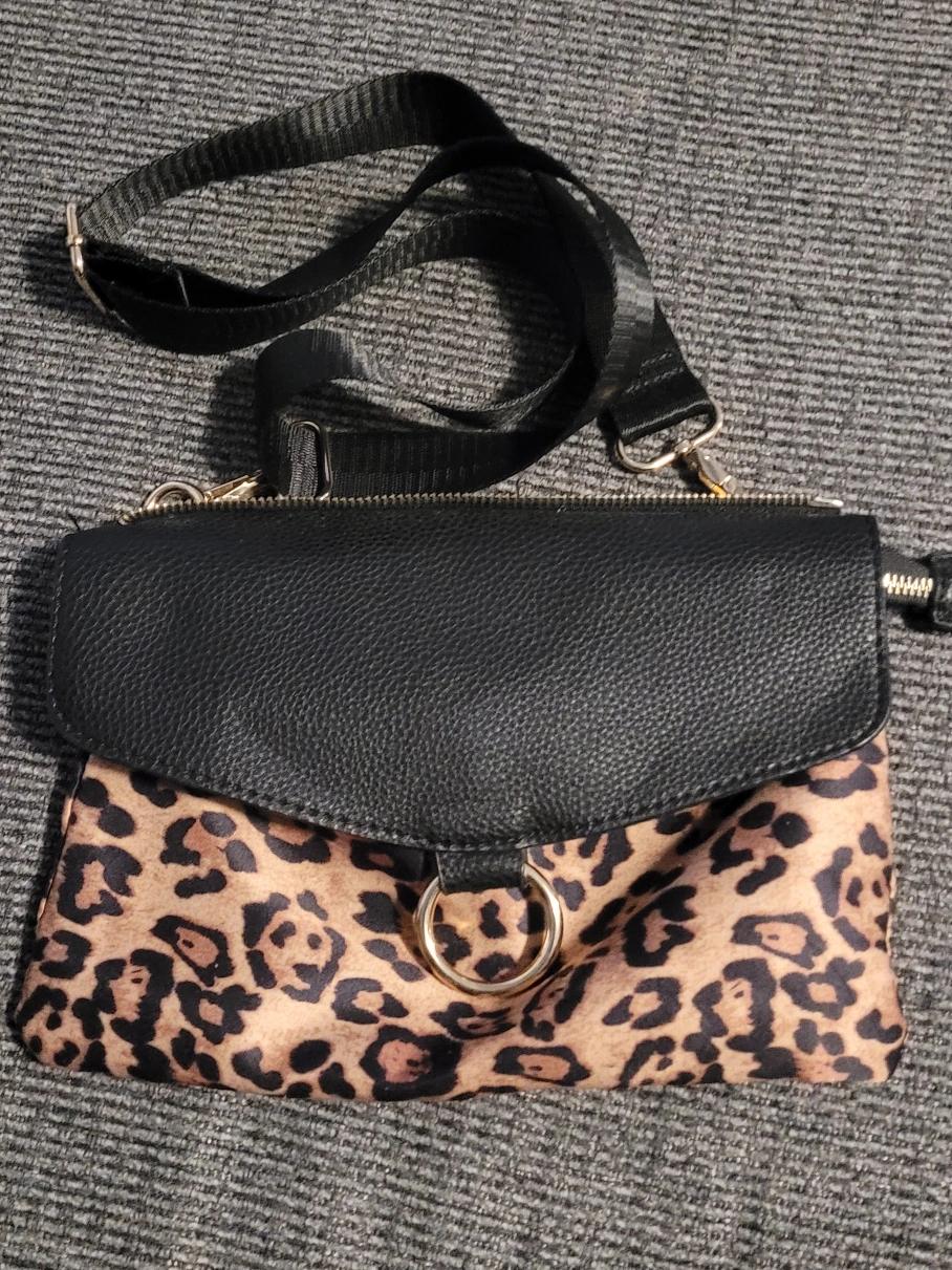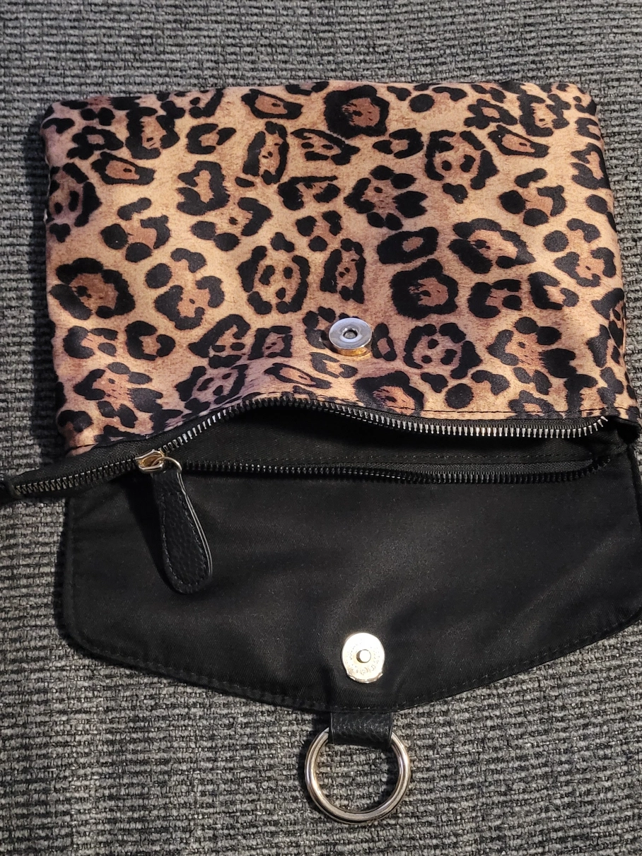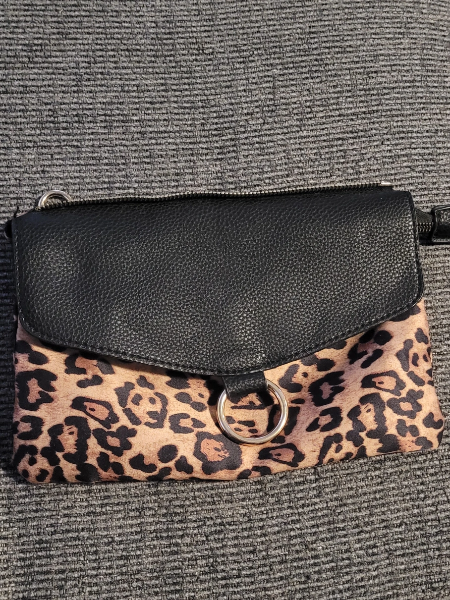 Stylish leopard print backpack and matching clutch. Both feature black faux leather accents. Backpack has two zippered compartments and two clip on straps that can be used on the smaller clutch bag. Or you can turn the backpack into a sling bag. Detachable clutch has a cute ring detail. Perfect for everyday use or a night out.