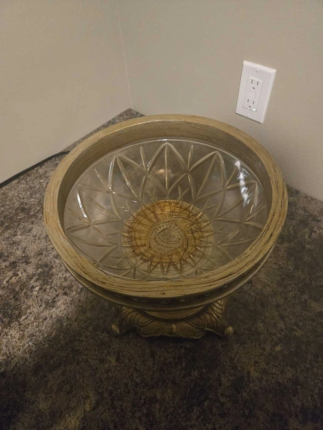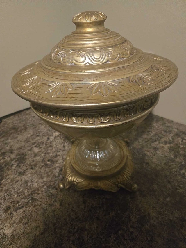 This is a beautiful, used decorative bowl with a lid, perfect for adding a touch of elegance to any room. The bowl features an ornate design and a golden finish, making it a standout piece, ready to be placed on your dining room table. A unique decor item. Colour: Gold. Cash accepted.