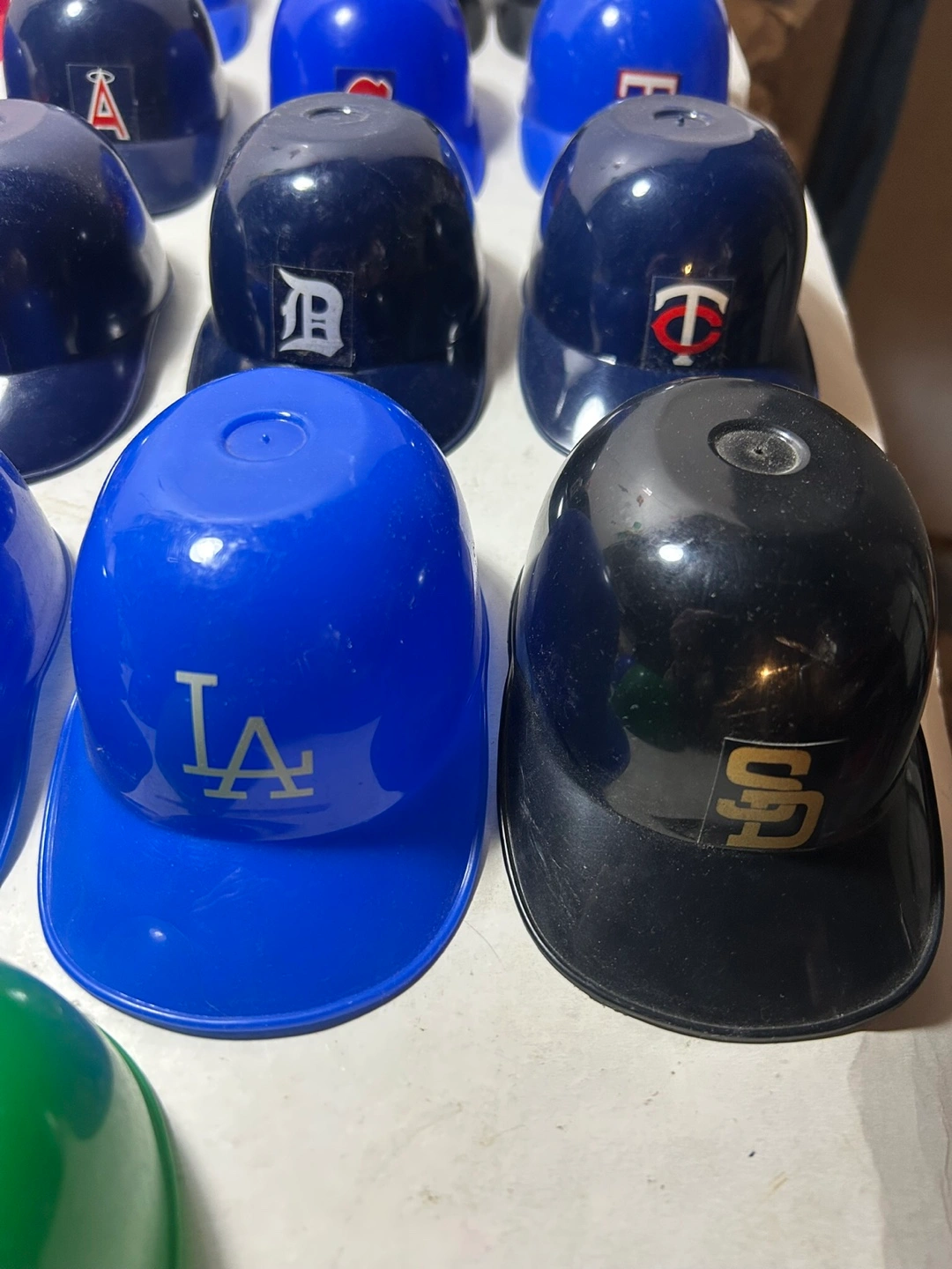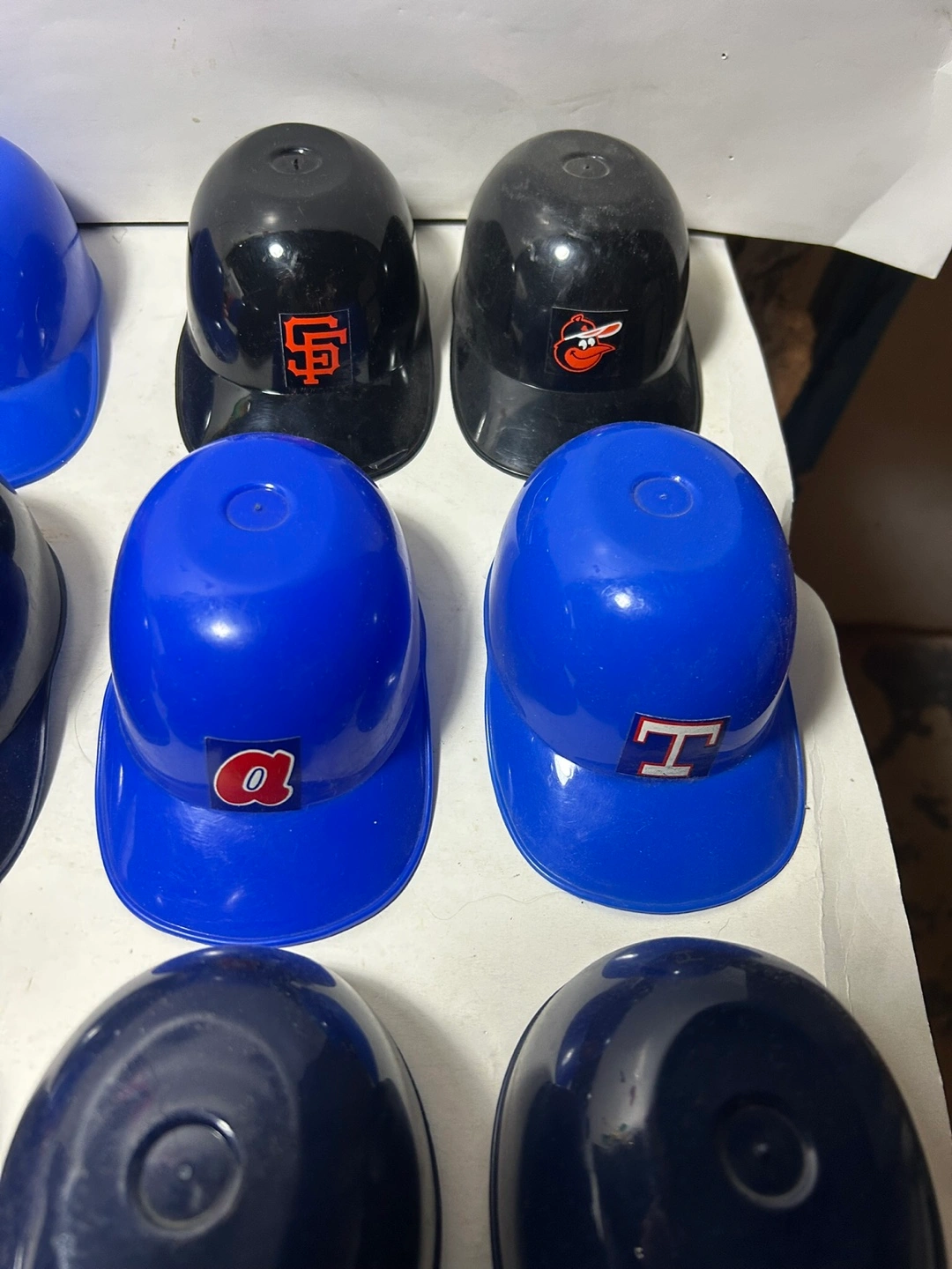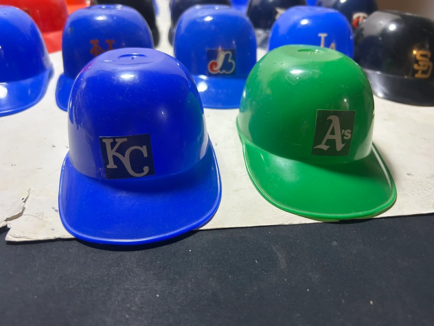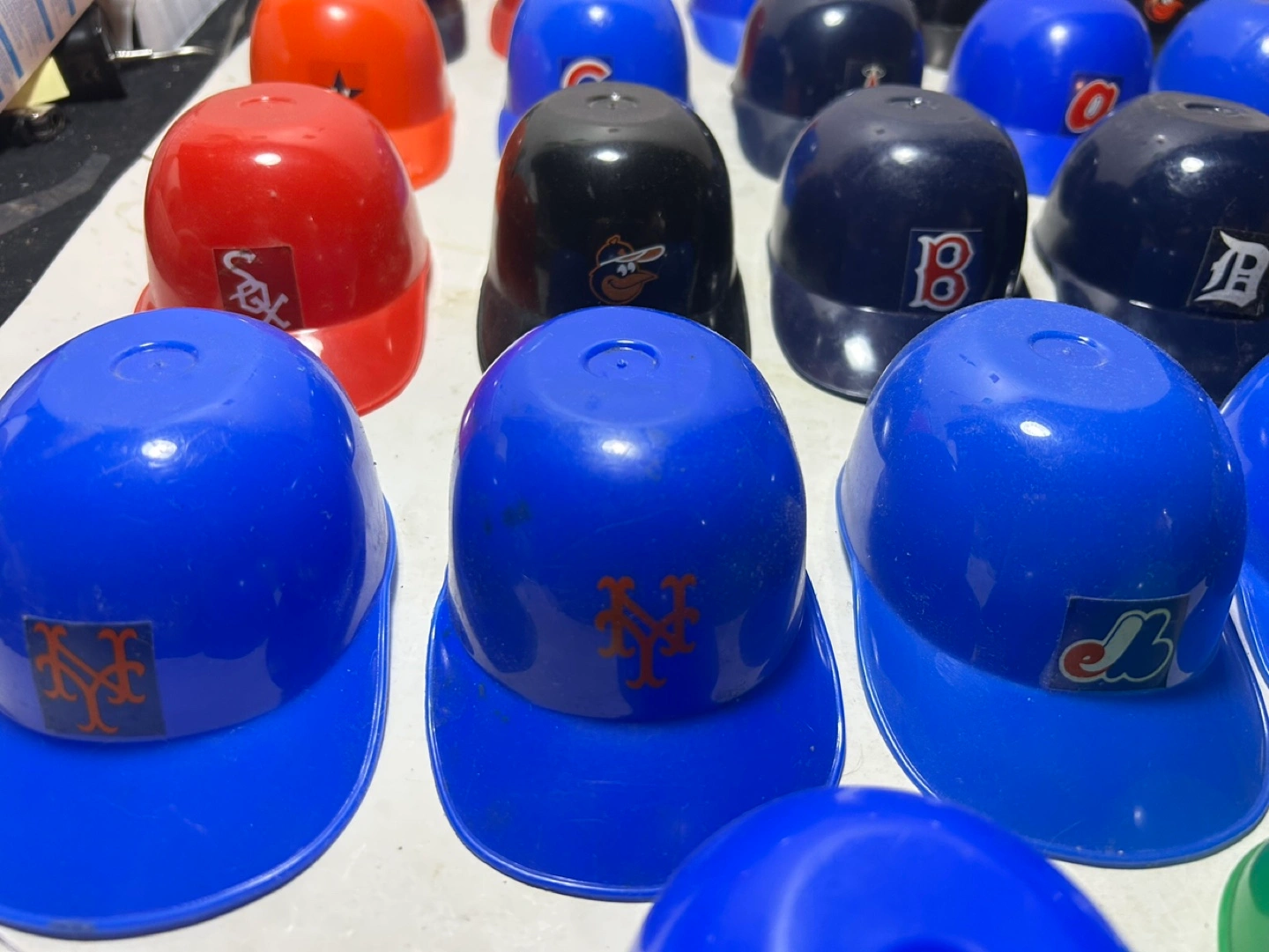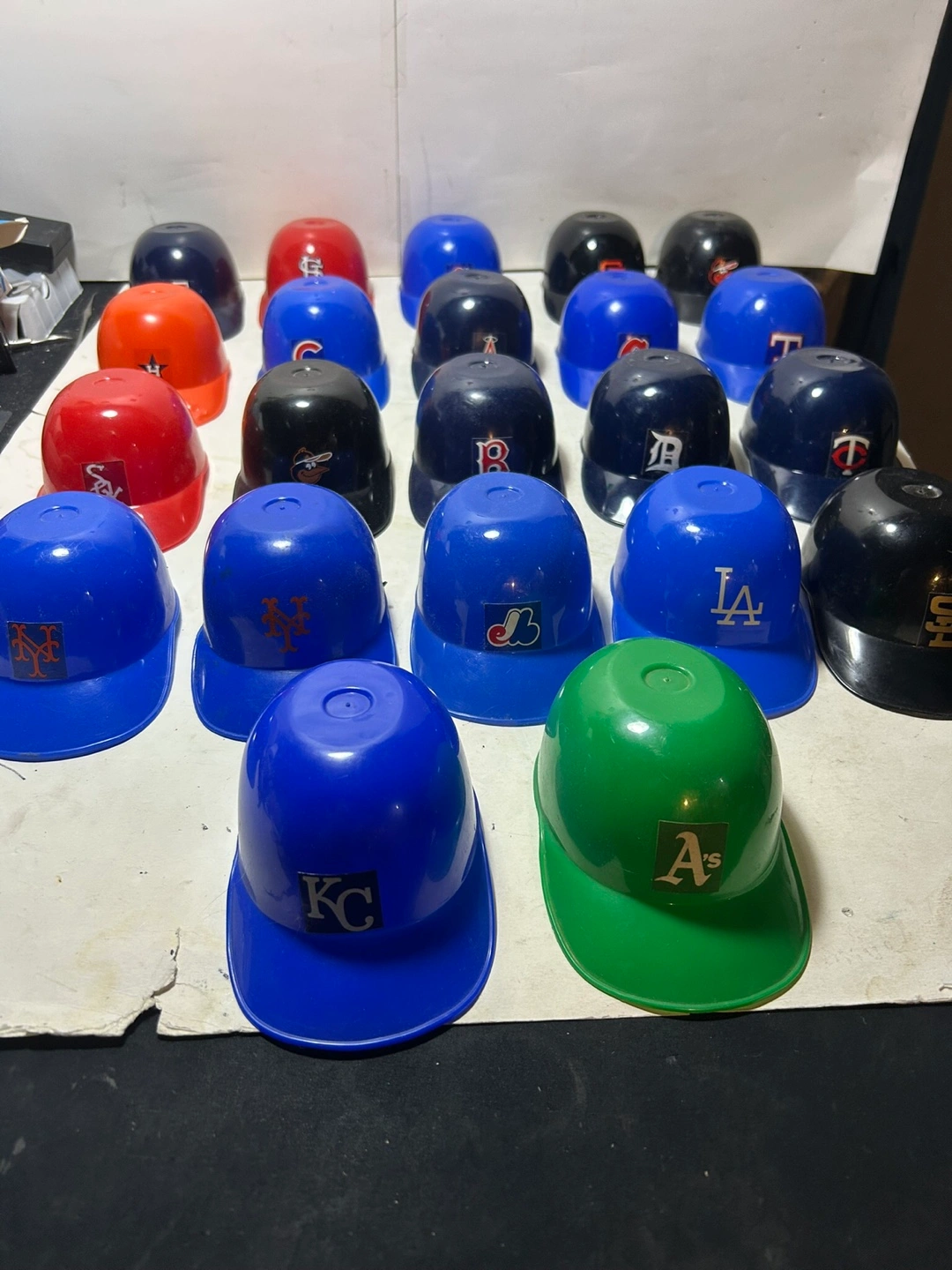 Collection of miniature plastic baseball helmets. Features various MLB team logos. These vintage Helmets Were Sold as Ice Cream Cups These are 5-1/2 long and 2-1/2 inches tall