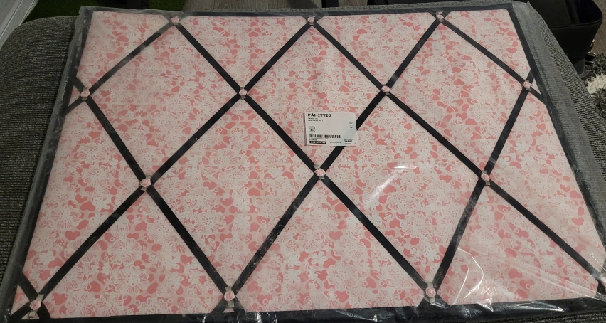 Pink and black patterned fabric notice board. Wall mountable. Still in origional packaging. Perfect for organizing photos, mementos or notes.