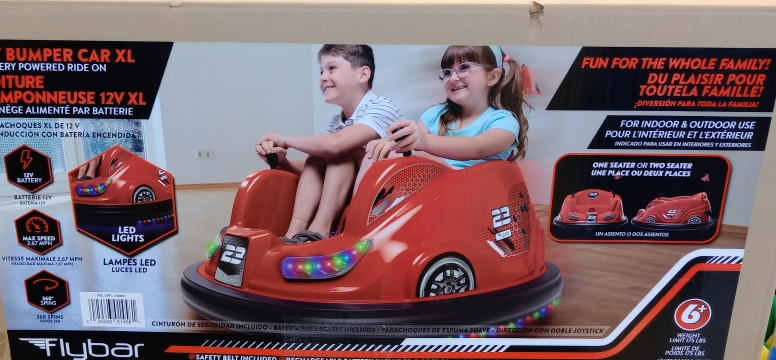 Battery-powered ride-on bumper car. LED lights. Max speed 2.67 mph. 360 spins. Indoor and outdoor use. One or two-seater. Safety belt included. BRAND NEW NEVER OPENED