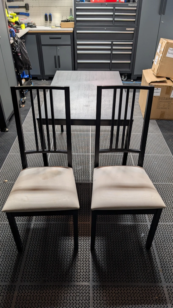 For sale is a kitchen table with two chairs. The table is in great shape, and one chair has a stain on it, but otherwise works as intended.