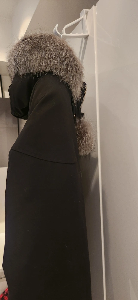 Gorgeous black parka (heavy). Features a fur-trimmed hood, 2 fur string pom-poms for hood, two front pockets. Removable Hood. Excellent for cold weather. Down-filled for warmth.