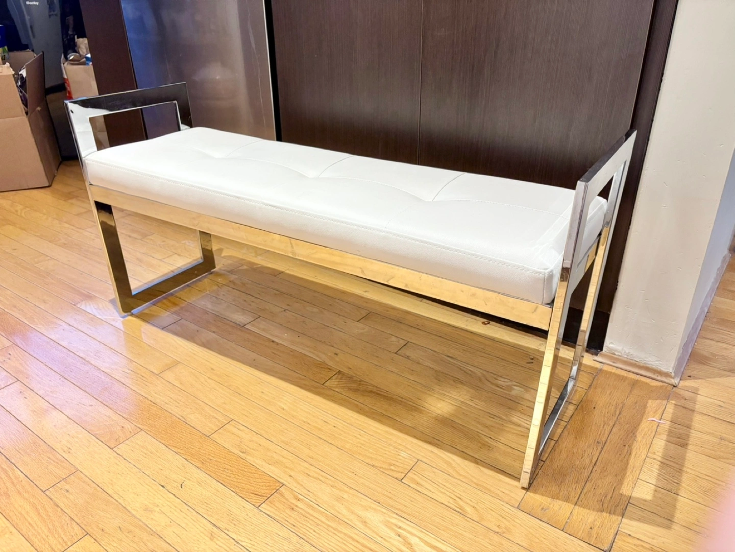 🤍bouclair white upholstered silver frame cushioned entry bench