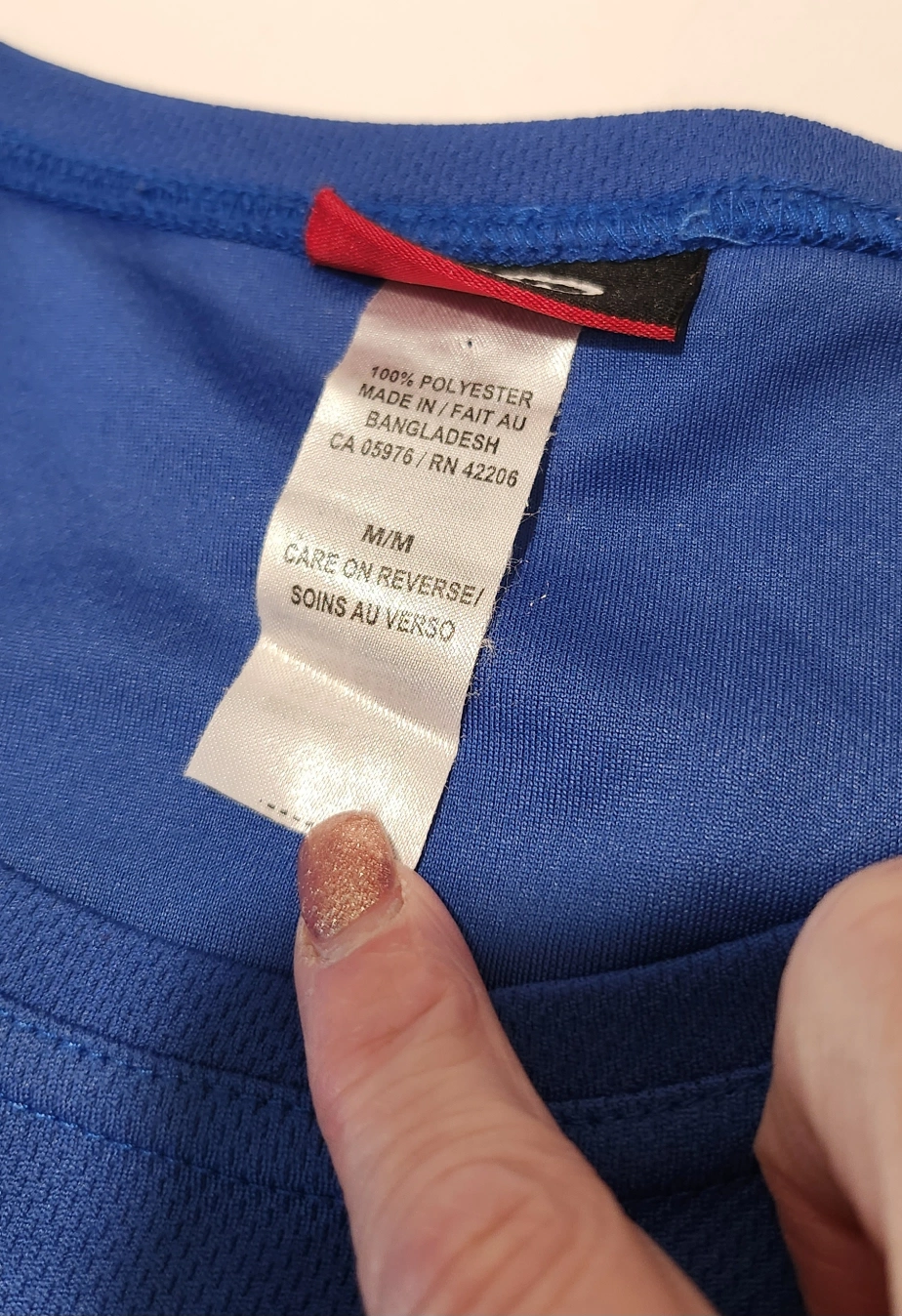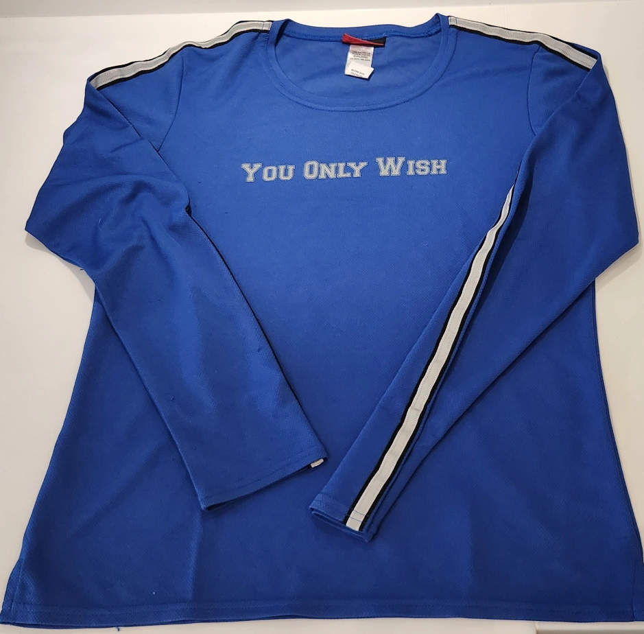 339Royal blue long-sleeve athletic shirt. Dri-fit. Features contrasting hi-vis and black stripes along the sleeves. Text on the front and back. 100% polyester.