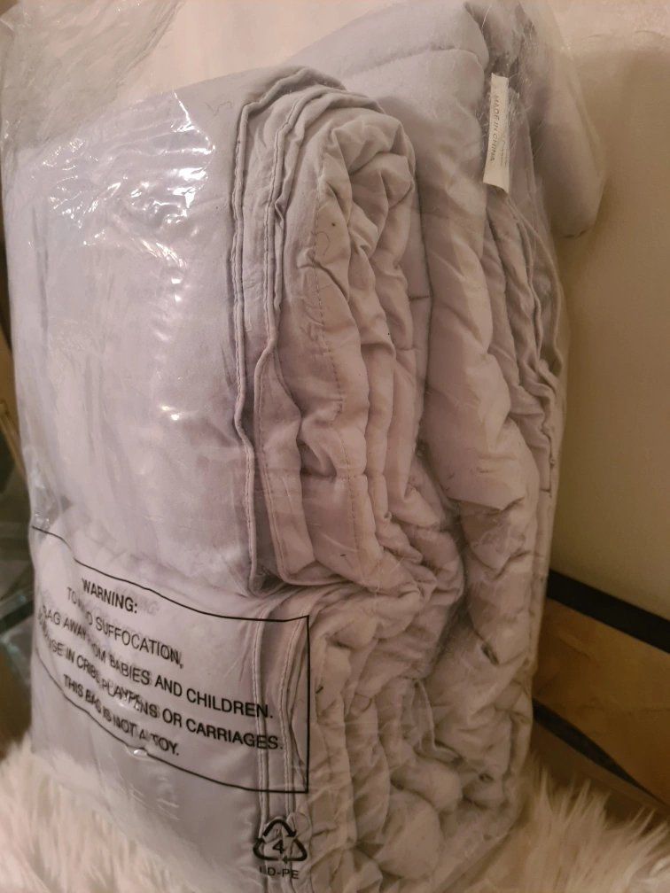 Brand new, light grey comforter set (comforter and 2 shams). Polyester shell and filling. Large size, fits a queen bed. In original packaging.