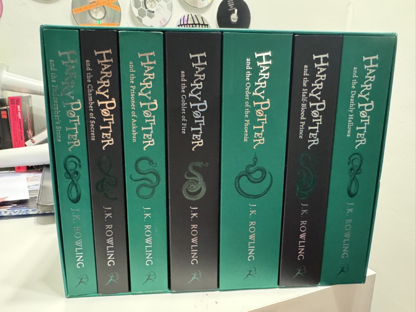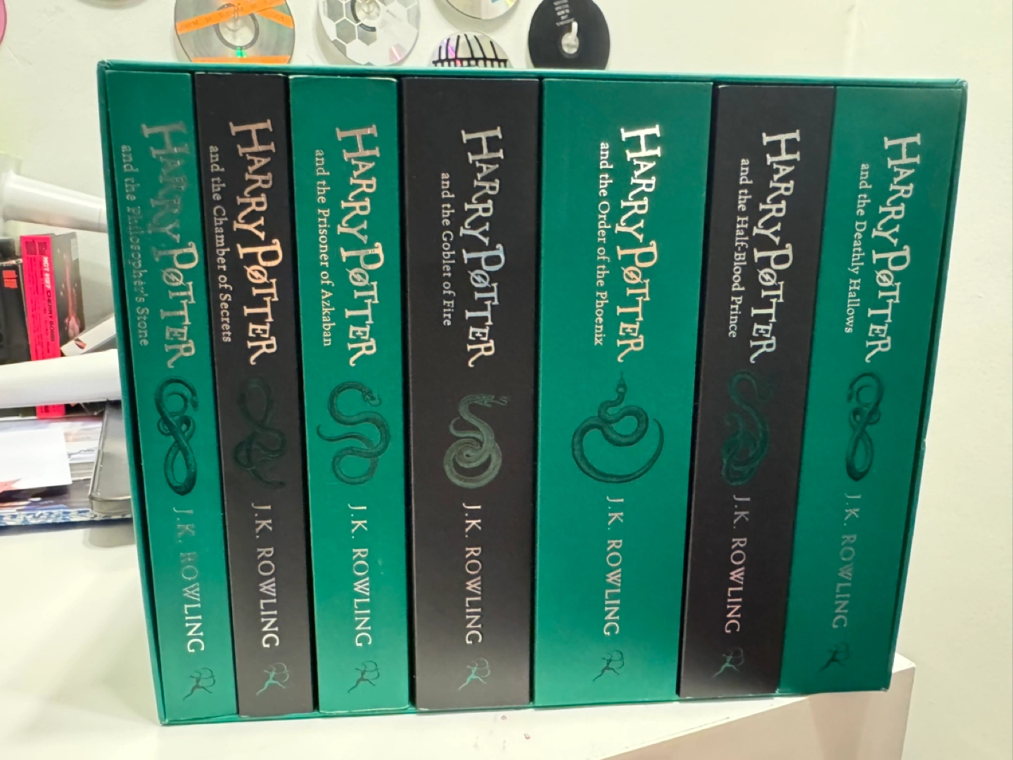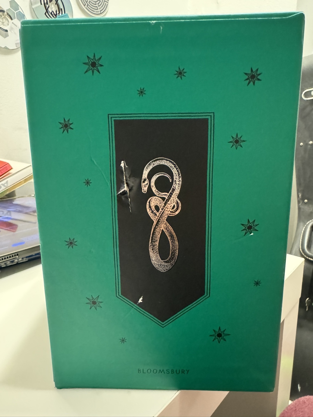 Complete seven-book Harry Potter collection in a green Slytherin-themed box. Books by J.K. Rowling. Bloomsbury Children's Books edition. Slight wear on the box. Books are like new.