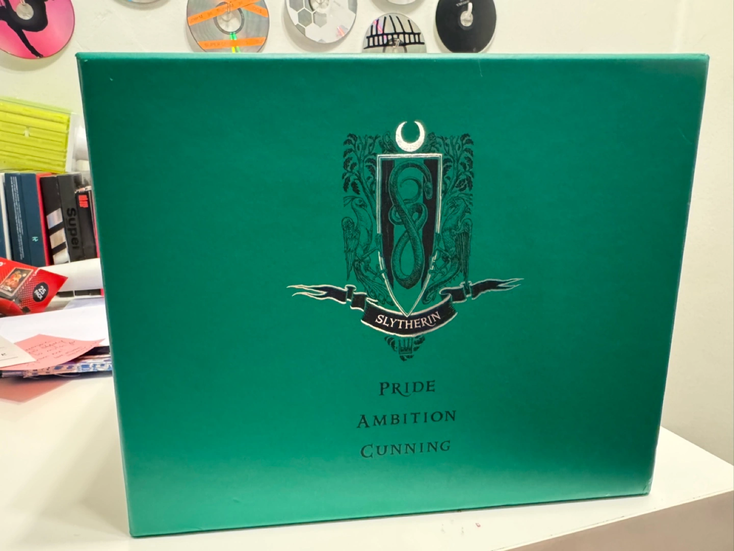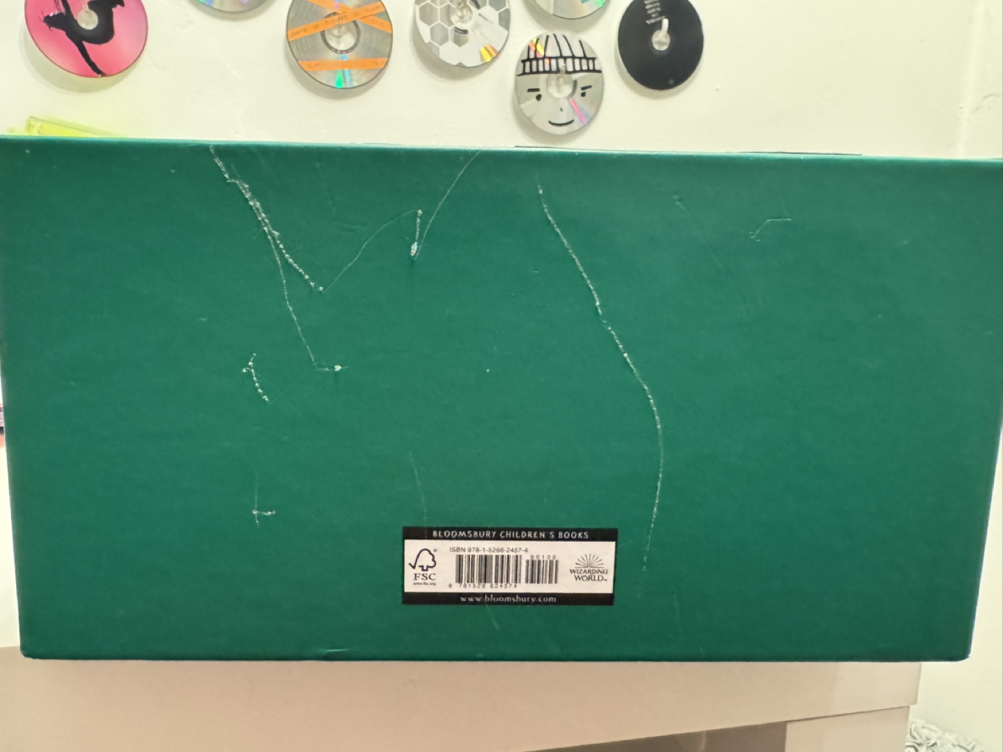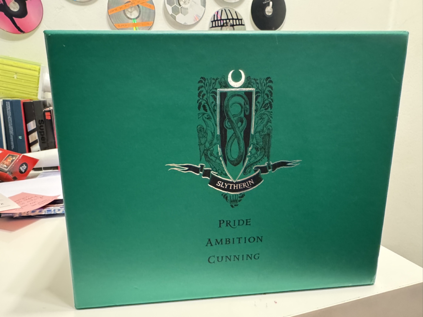 Complete seven-book Harry Potter collection in a green Slytherin-themed box. Books by J.K. Rowling. Bloomsbury Children's Books edition. Slight wear on the box. Books are like new.