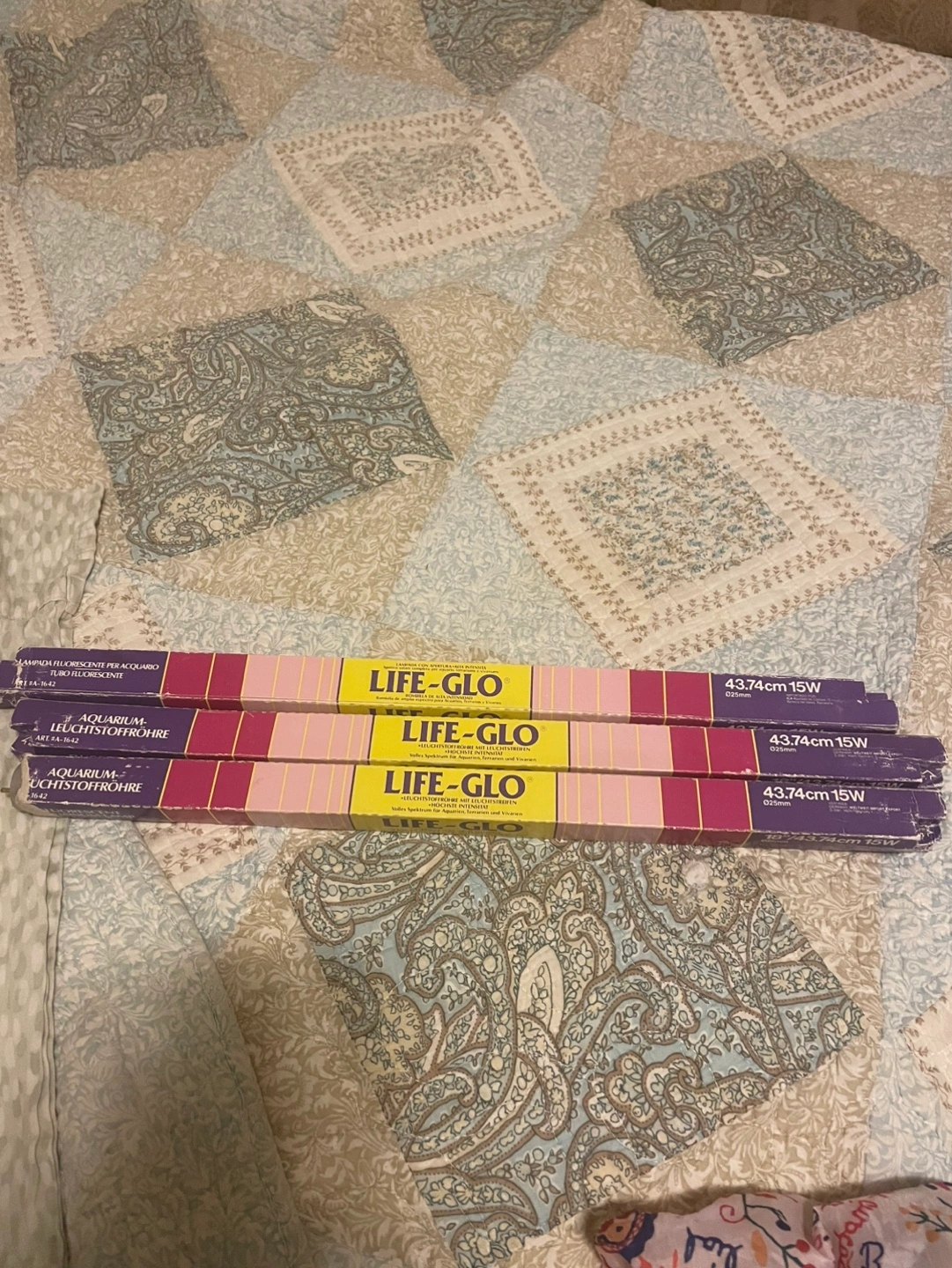 Three new, unopened LIFE-GLO fluorescent tubes. 15W, 43.74cm length. Designed for aquariums. Original packaging.