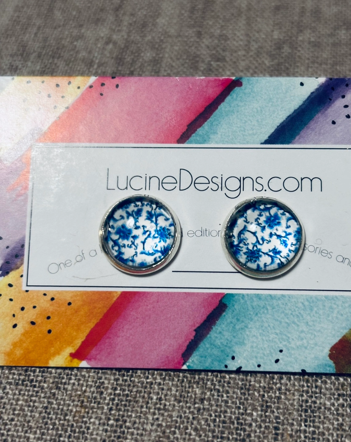 Pair of stud earrings. Features a blue and white floral design. Silver-toned metal settings. One of a kind.
