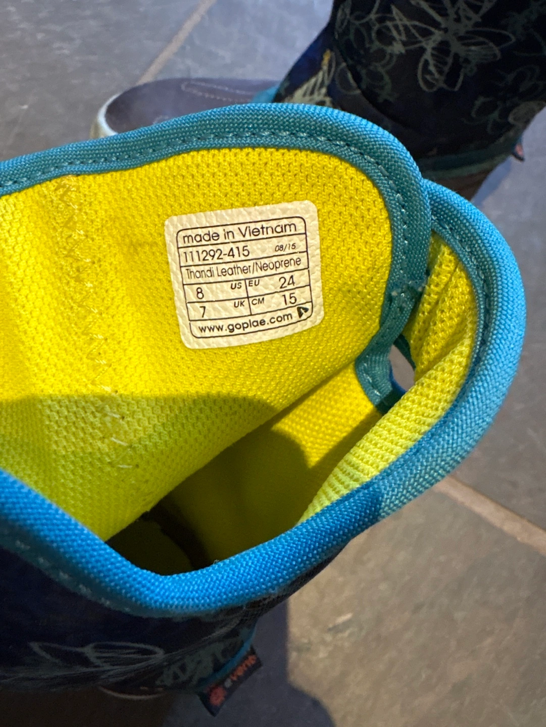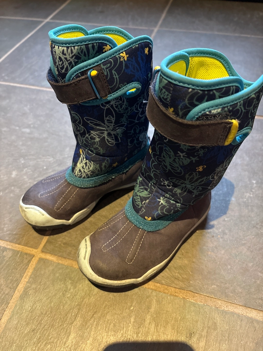 GoPlae kids' winter boots. Size 8. Waterproof and feature eVent technology. Teal, navy, and yellow colour scheme. Fun pattern. Good condition. Pickup only near Bayview and John in Thornhill
