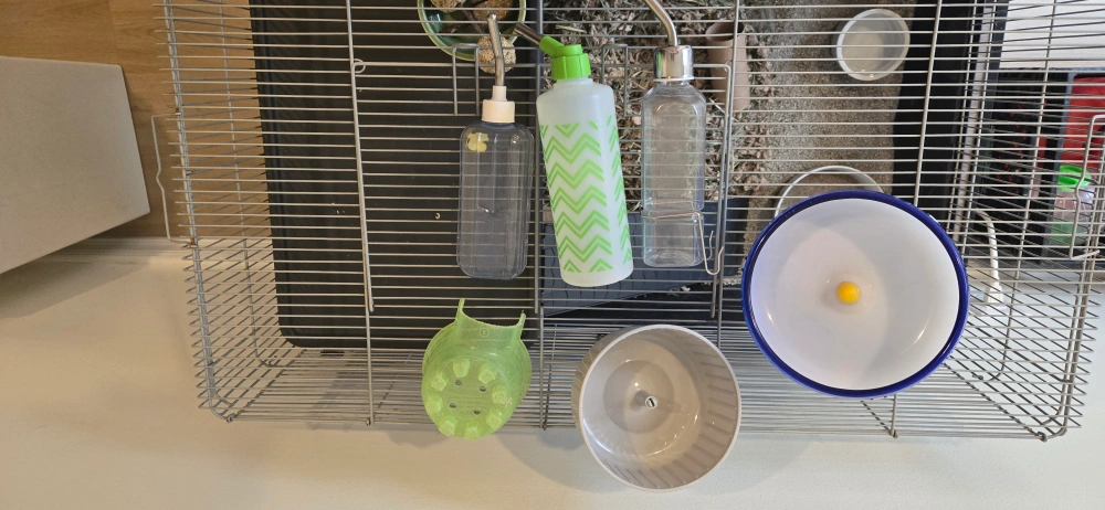 Includes three water bottles, two food bowls, and two exercise wheel.