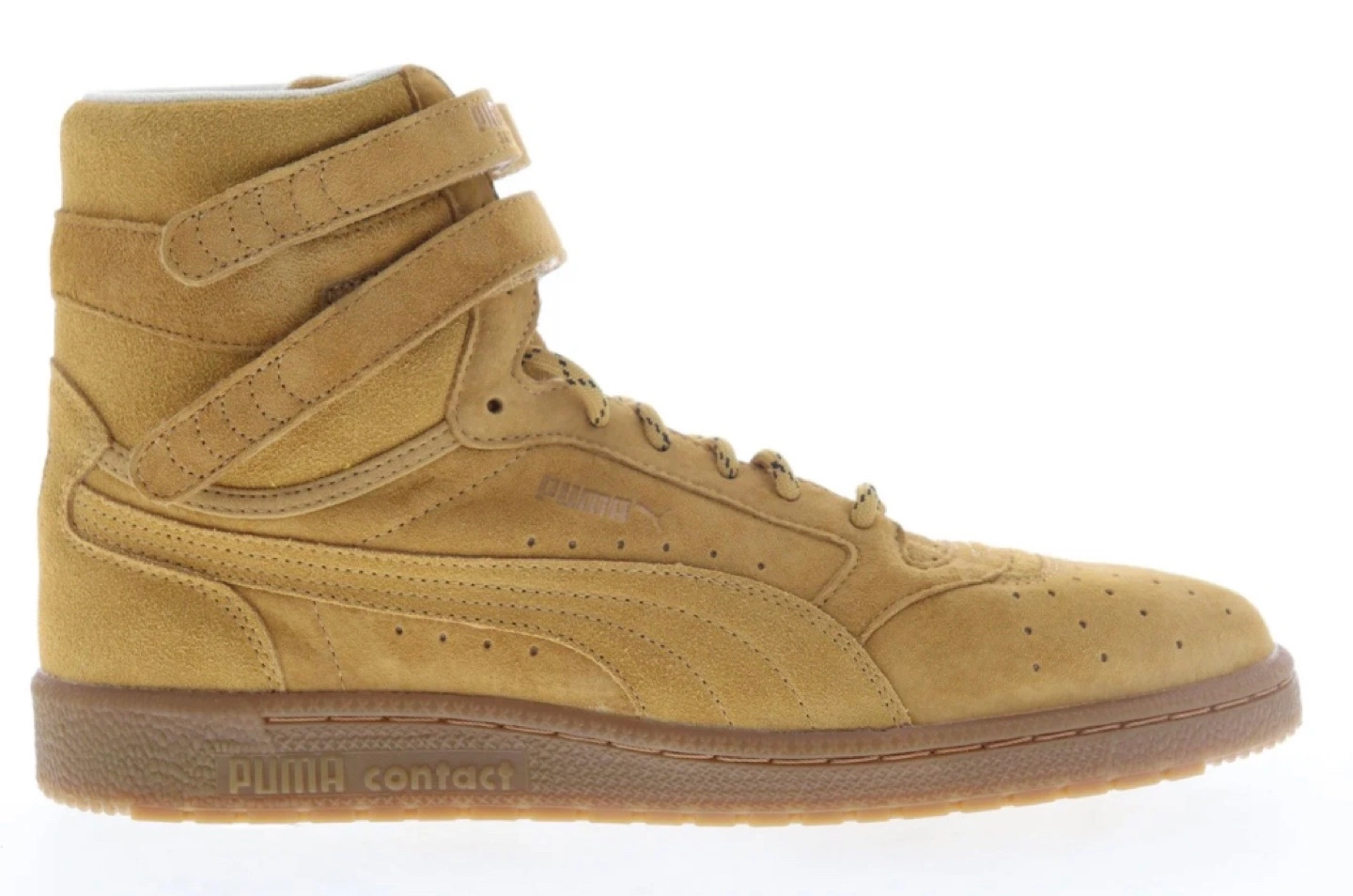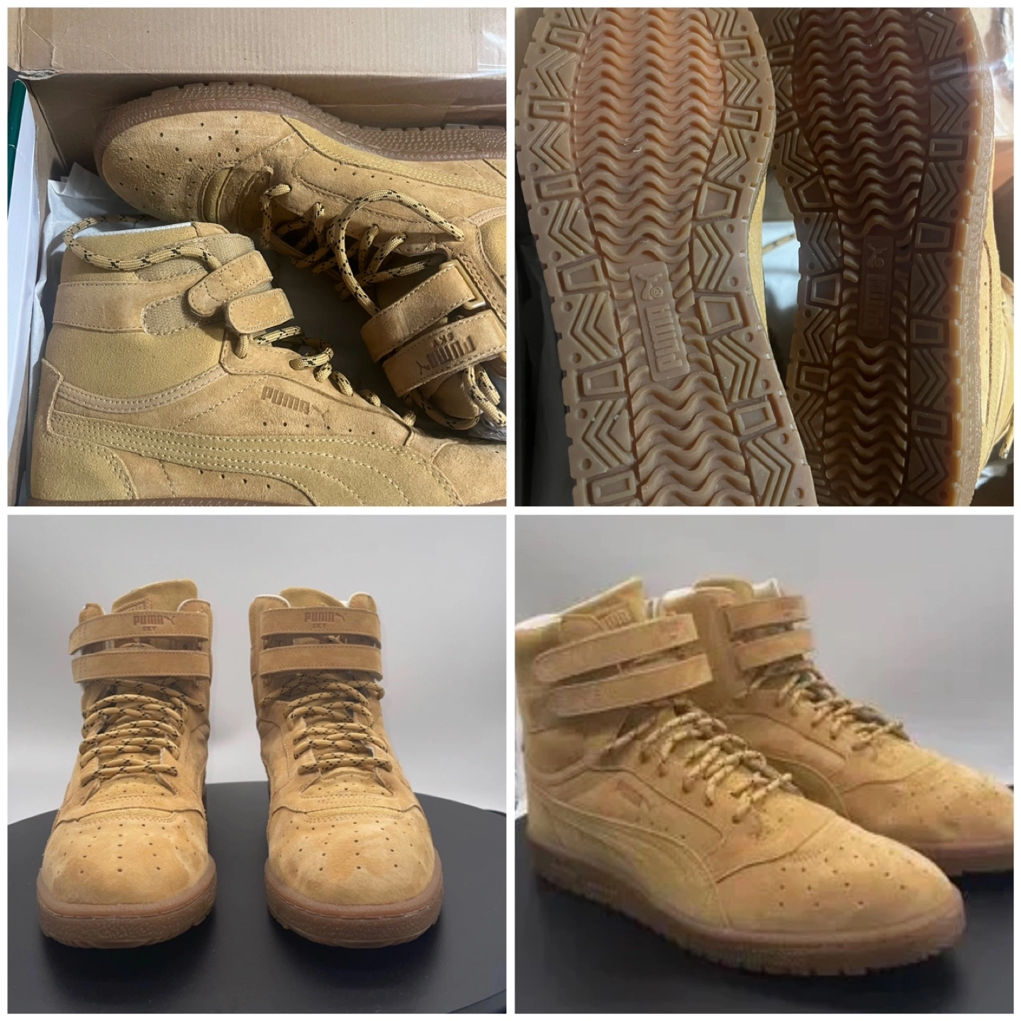 High top sneakers. Tan suede material. Features velcro straps and laces. Gum sole. Puma branding throughout. Brand New. Ladies size 8.5