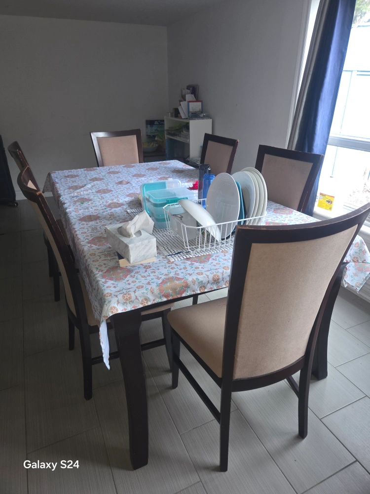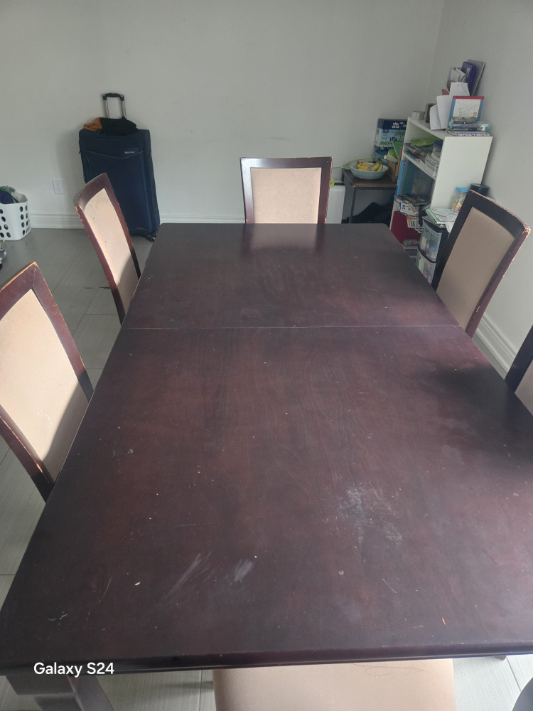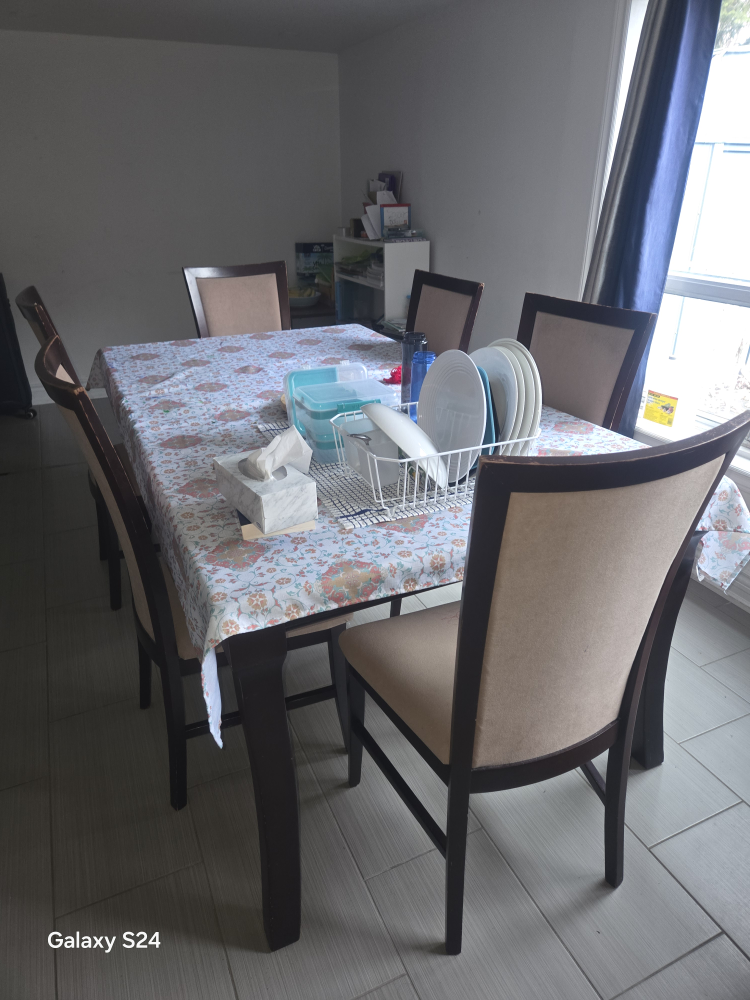 Dark brown wood dining table. 8 beige cushioned chairs. Good condition.