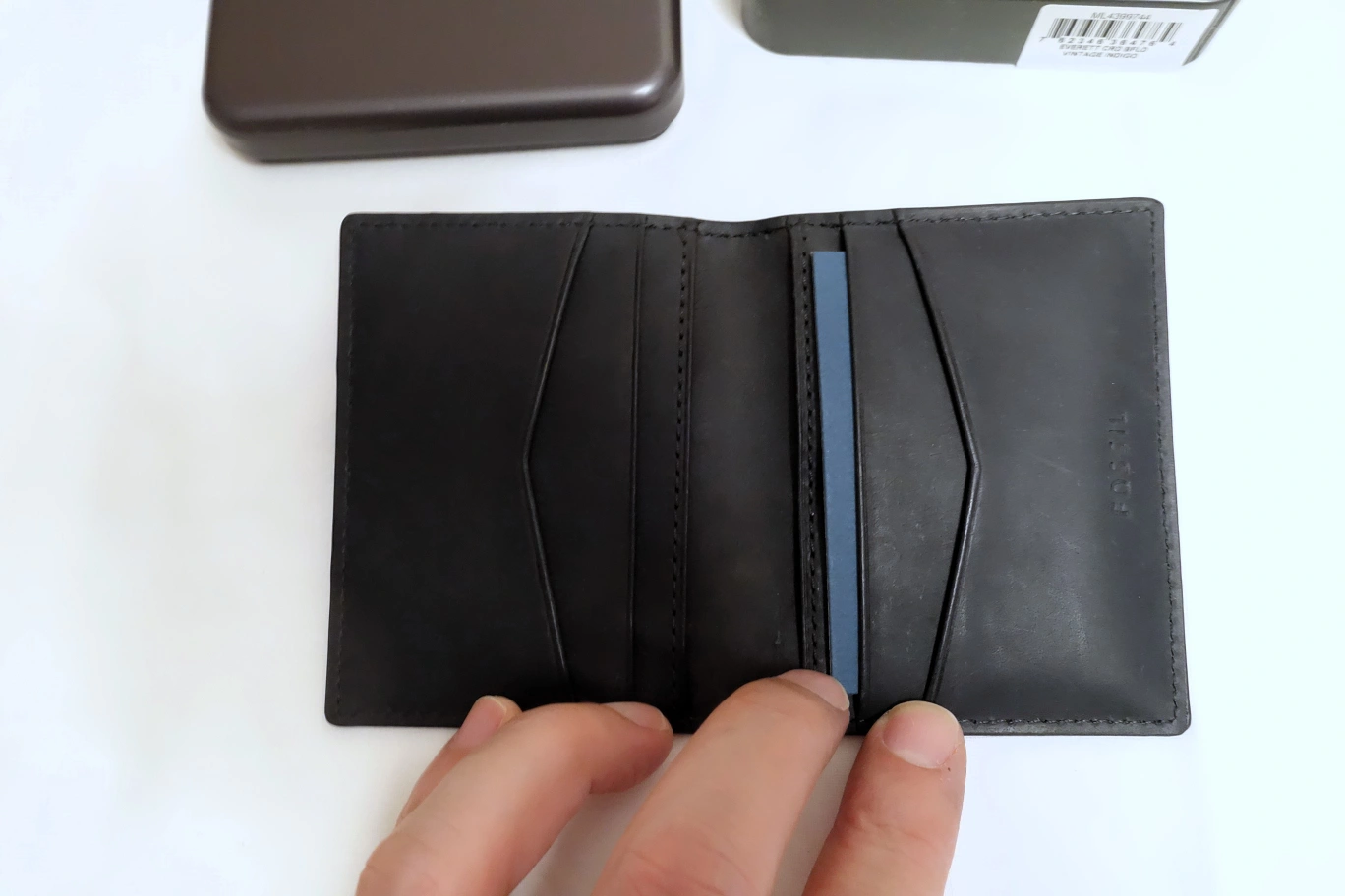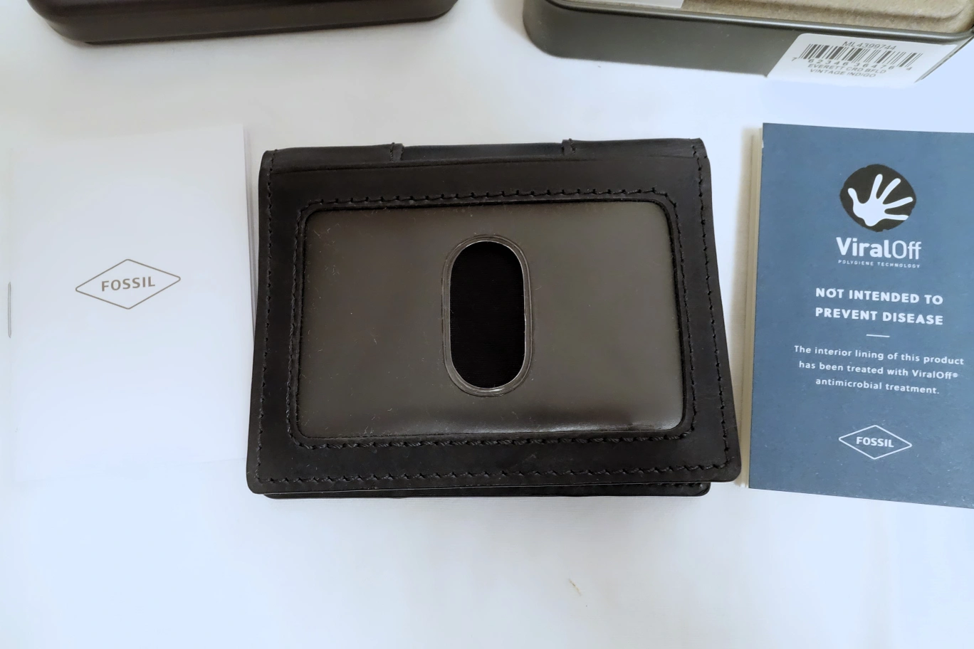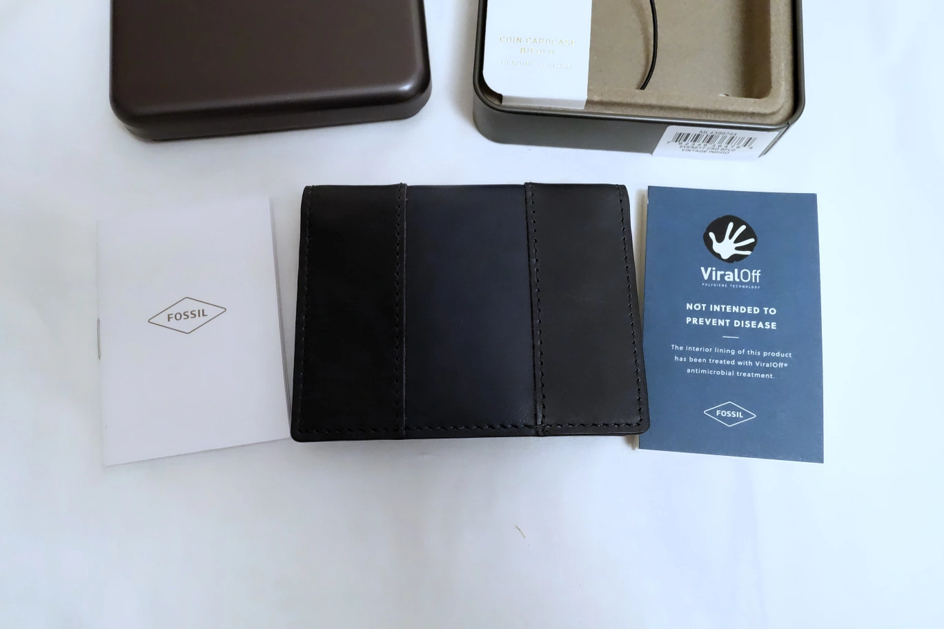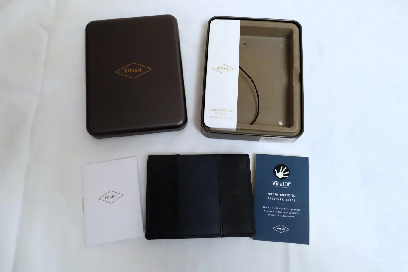 New Fossil leather card holder wallet. Compact design, multiple card slots. Comes in original box. Interior lining treated with ViralOff antimicrobial treatment.