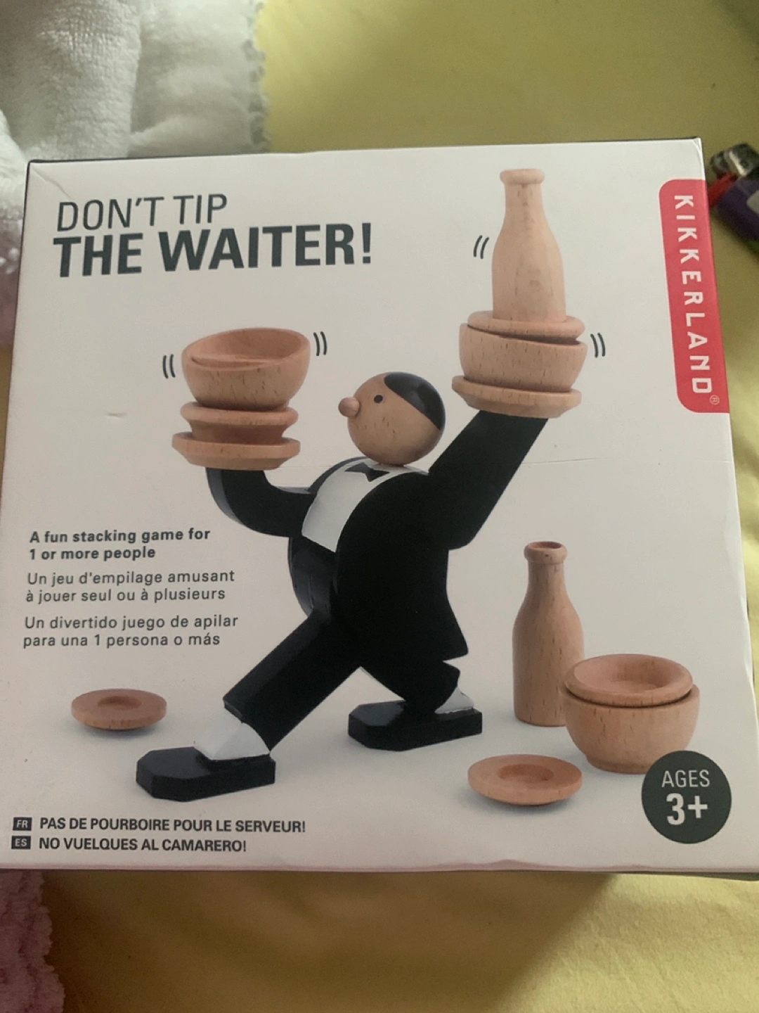 Fun stacking game for one or more players. Includes wooden waiter figure and various pieces to stack. Ages 3+