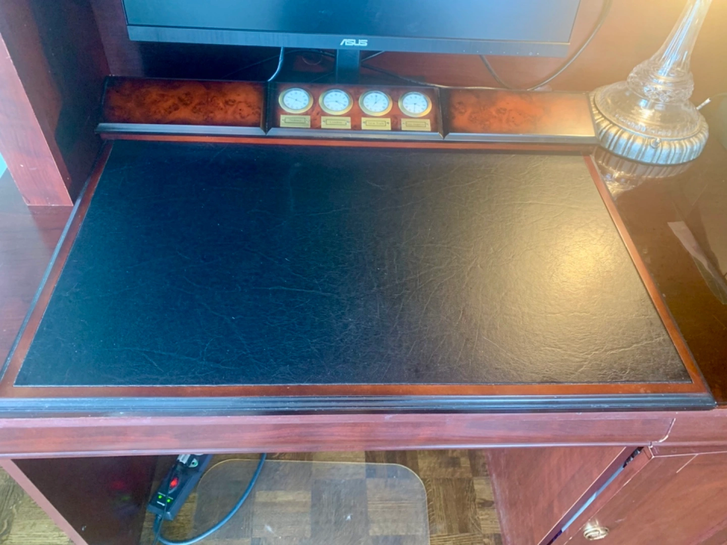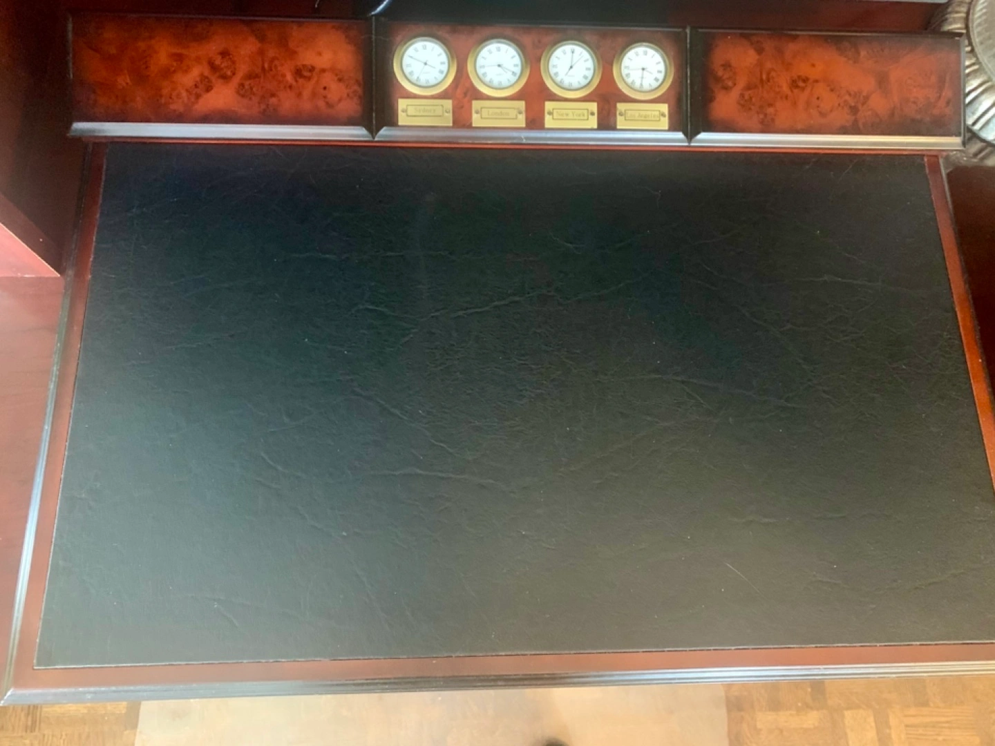 Must go this week! Unique vintage desk mat. Features a dark leather-like writing surface, wood frame, and built-in storage. Includes a multi-city clock set with exchangeable brass plates. Has protective rubber feet. Excellent for adding a touch of class to your workspace. Giving it away because new desk has a work area that is sadly too small for this.