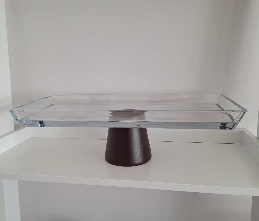 New heavy glass stand with sold brown base. Looks very nice! Purchased in bulk for gifting, have a few pieces left.
