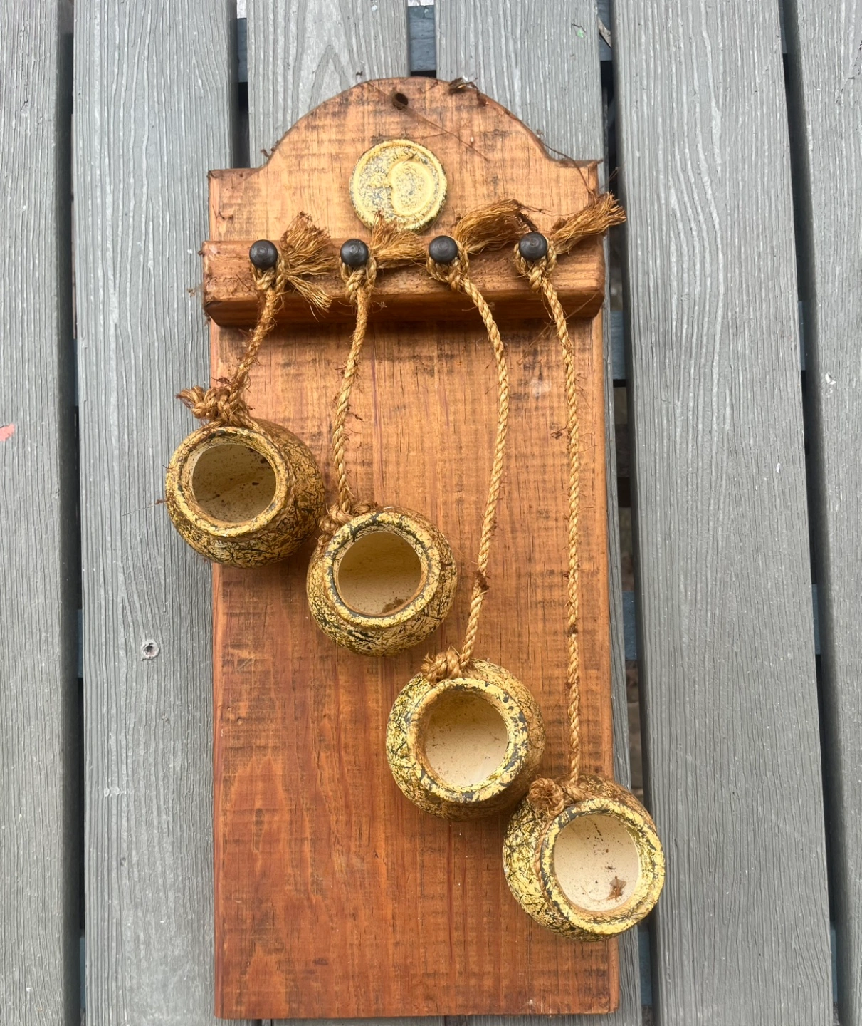 Charming rustic wooden planter. Features four small hanging pots. Unique design.