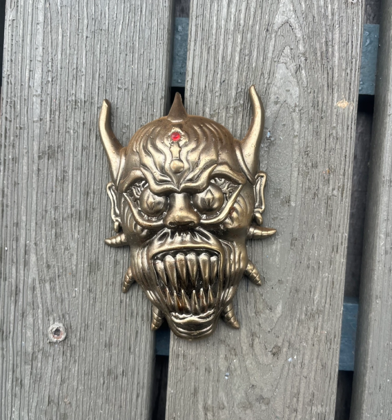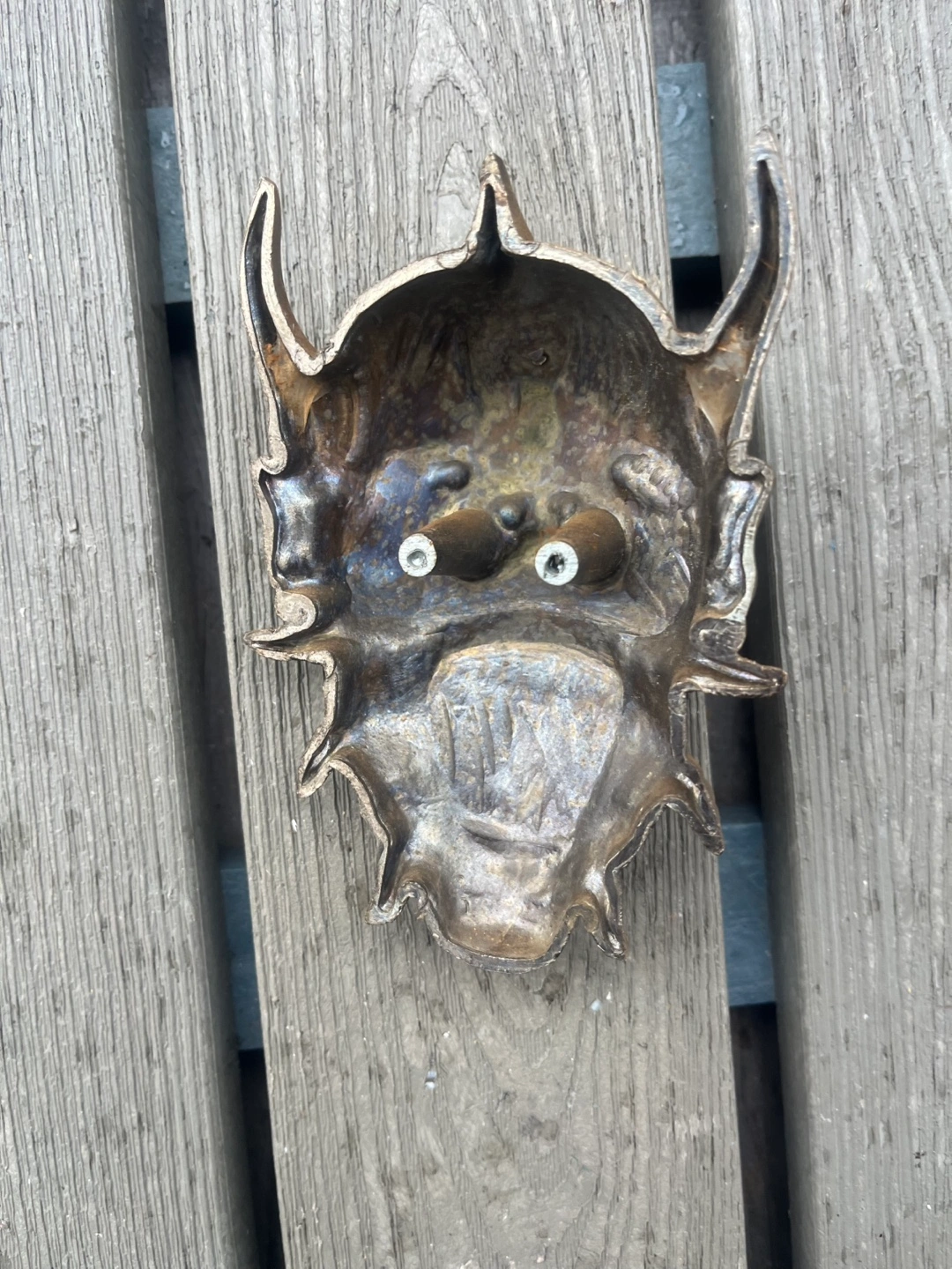 58Unique brass oni mask. Great for adding character to any space. Shows signs of age and wear. Could be used as wall art or a decorative piece.