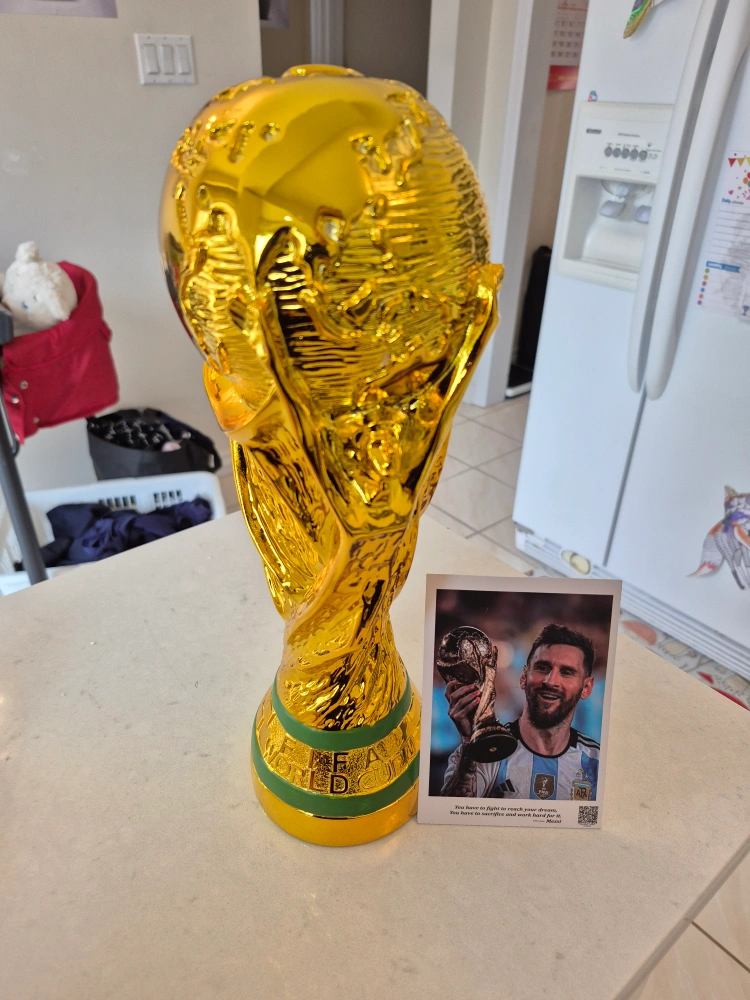 Gold-coloured resin 36cm replica of the FIFA World Cup trophy. Features detailed carvings and a green band at the base. Includes a photo of Lionel Messi holding the World Cup.