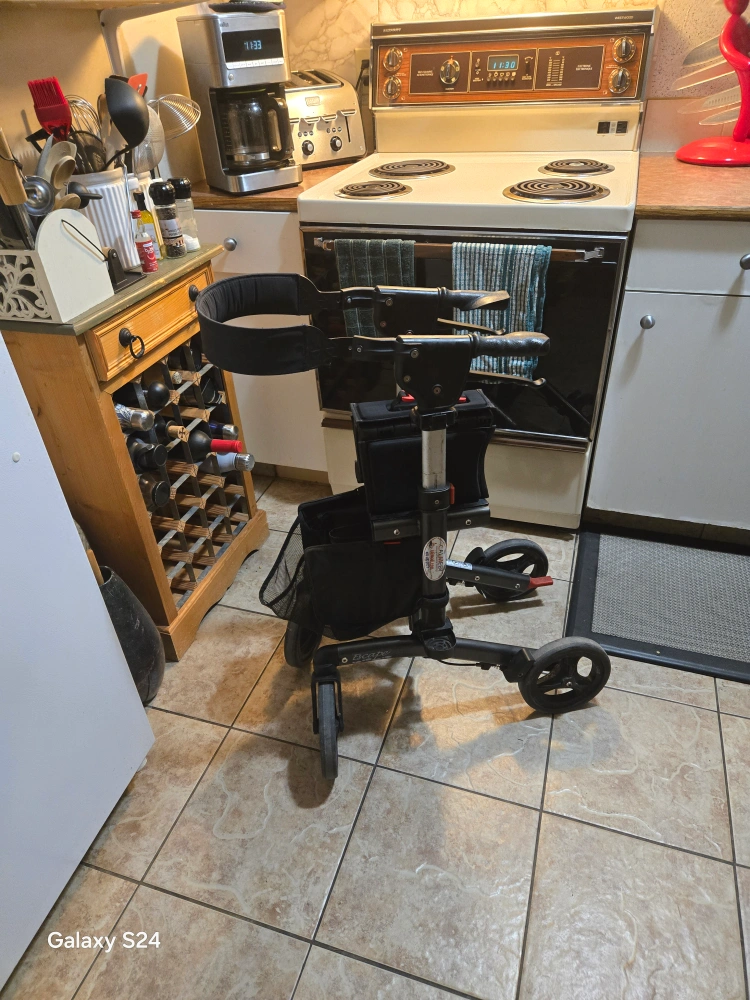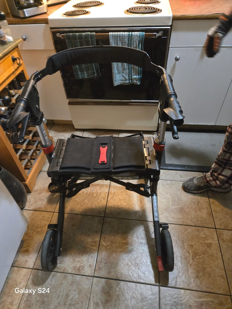 Lightweight rollator walker. Features include a padded seat, storage basket, and I'm giving it away for someone who is in need of it and are on a fixed income or disability hope to bring a smile on someone 😀 face