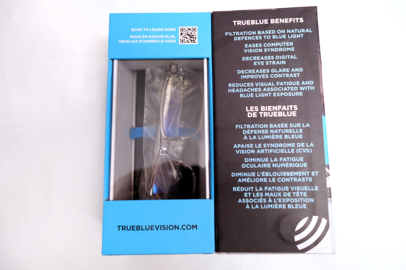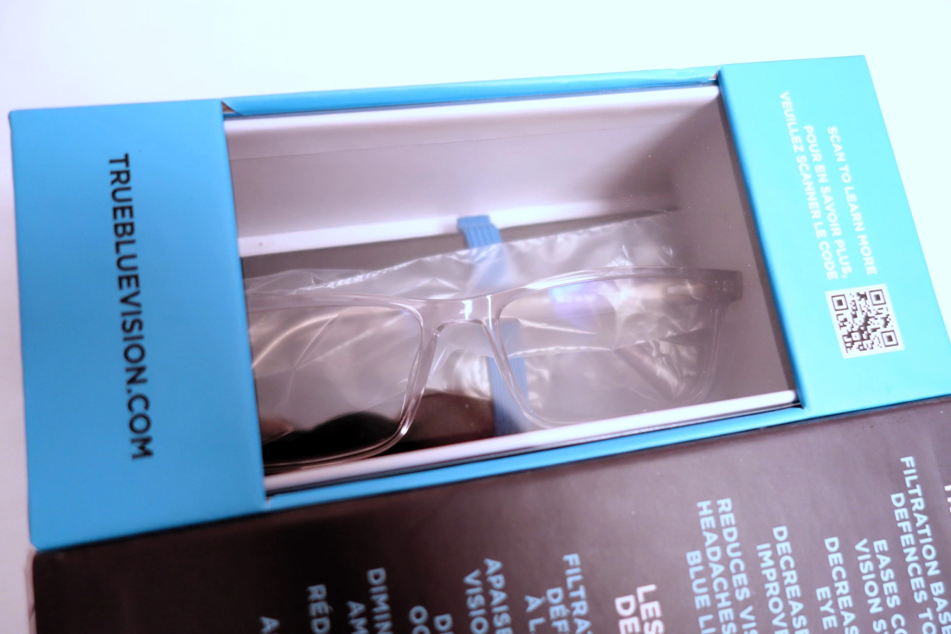 New TrueBlue Vision Hudson blue light glasses. Unisex style, lightweight and durable. Includes protective case and cleaning cloth. Filters blue light, eases computer vision syndrome, and decreases digital eye strain.