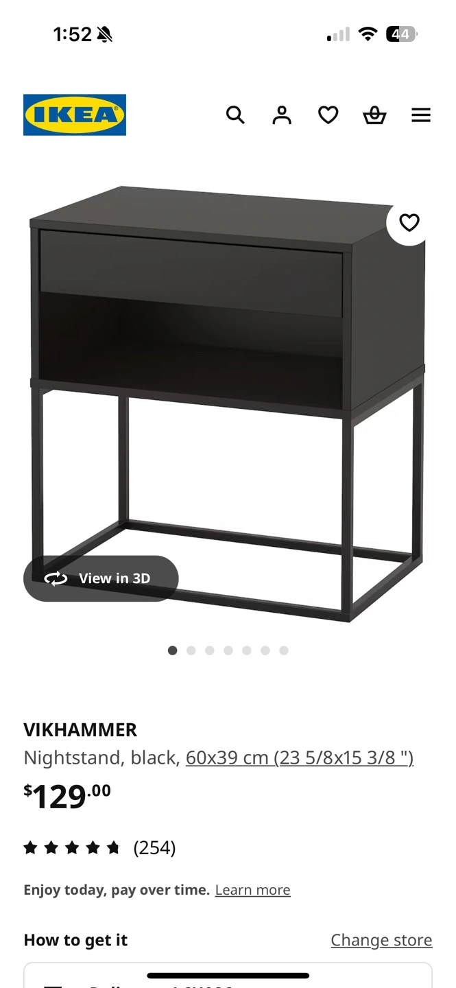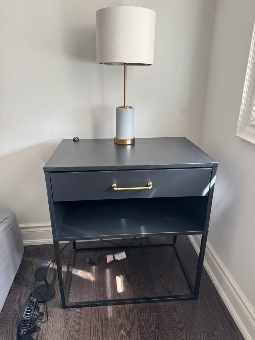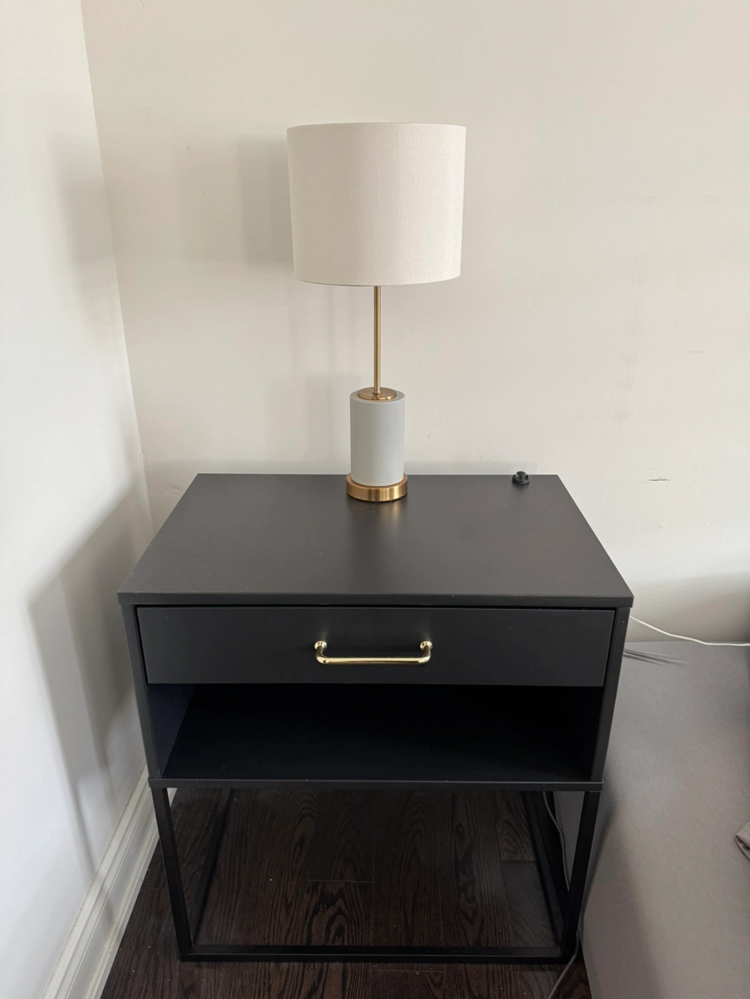 Black nightstand with gold handles and soft close drawer