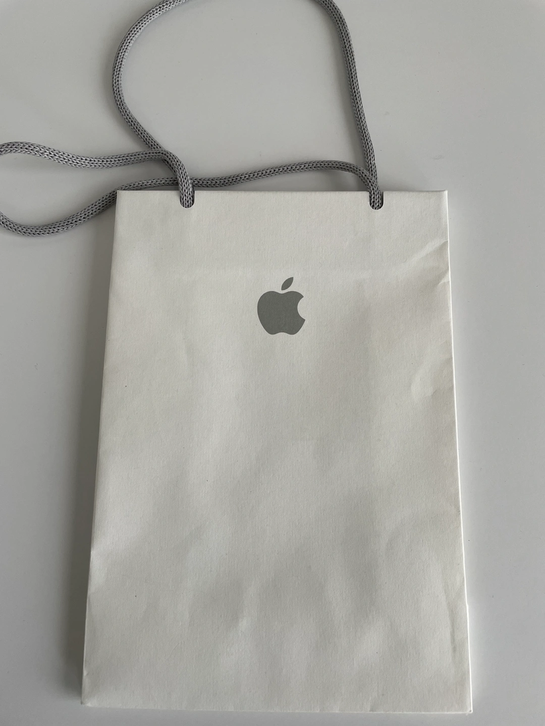 Off-white paper bag. Features a grey Apple logo and grey rope handles. Unused.