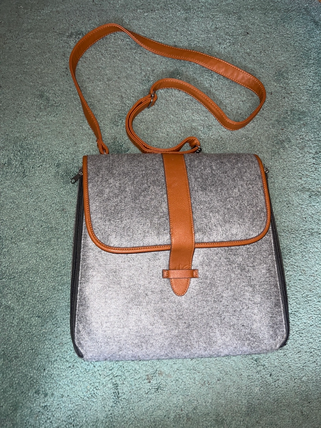 Stylish gray felt crossbody bag. Features brown faux leather accents and adjustable strap. Multiple interior pockets for organization. Zipper closure.