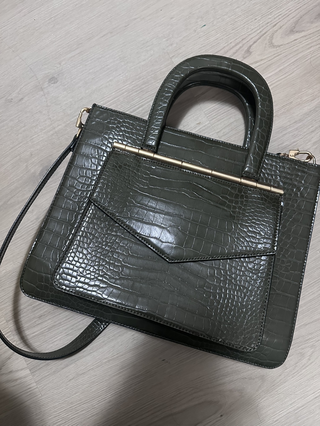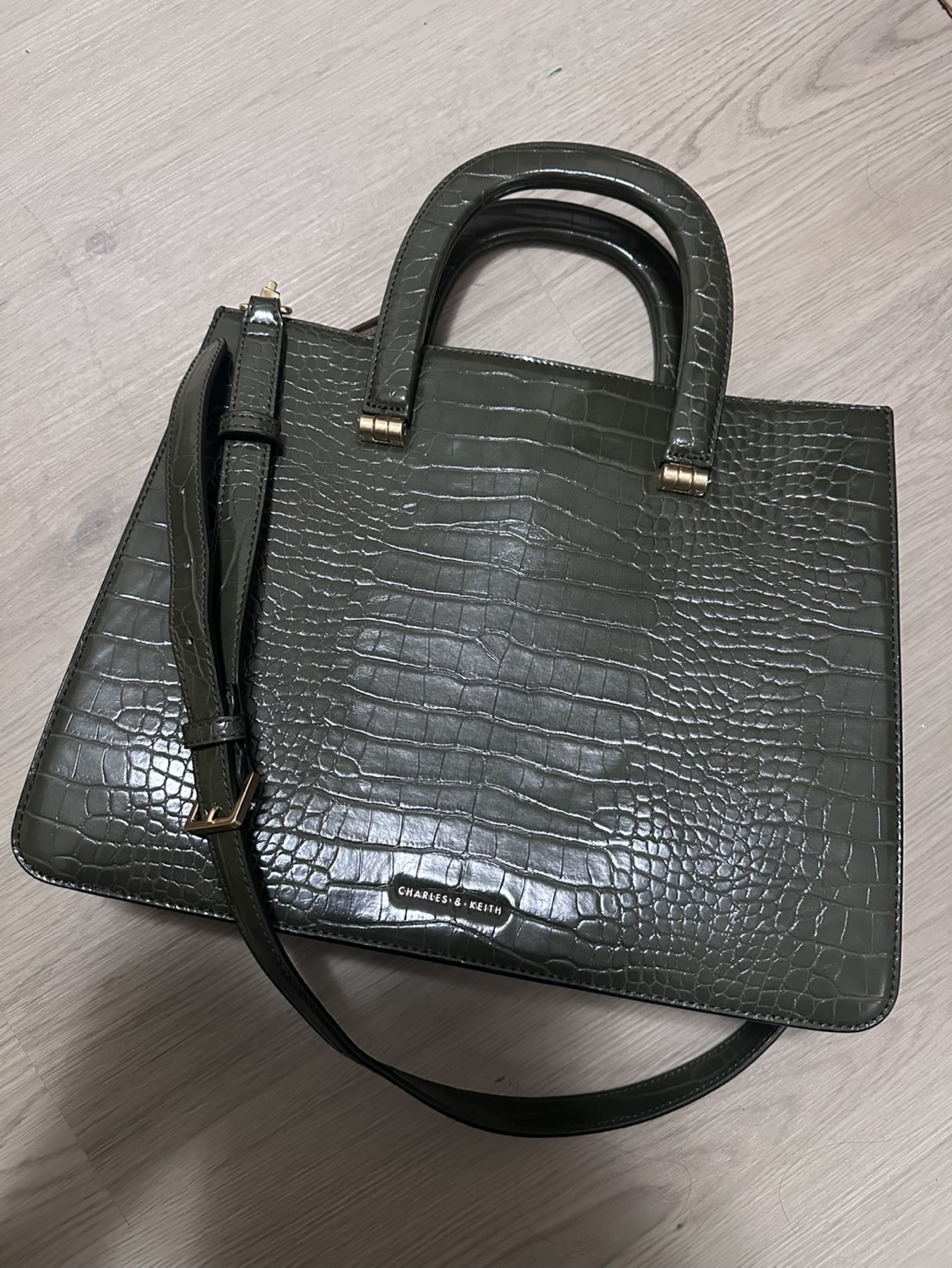 Charles & Keith Olive Green Crocodile-Embossed Handbag