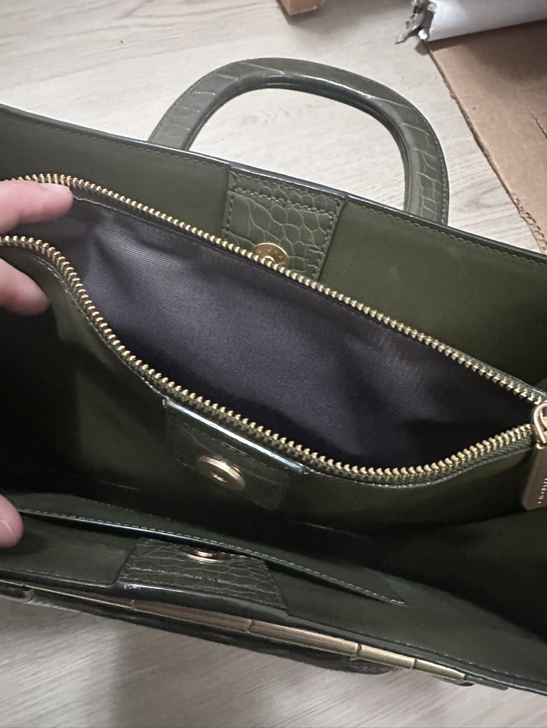 Stylish olive green handbag. Features a crocodile-embossed design, top handles, and a detachable shoulder strap. Gold-toned hardware accents. Interior zippered pocket.