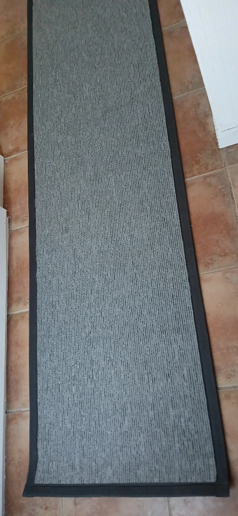 Long grey runner rug. Features a black border. Good for hallways or entryways. Machine washable.