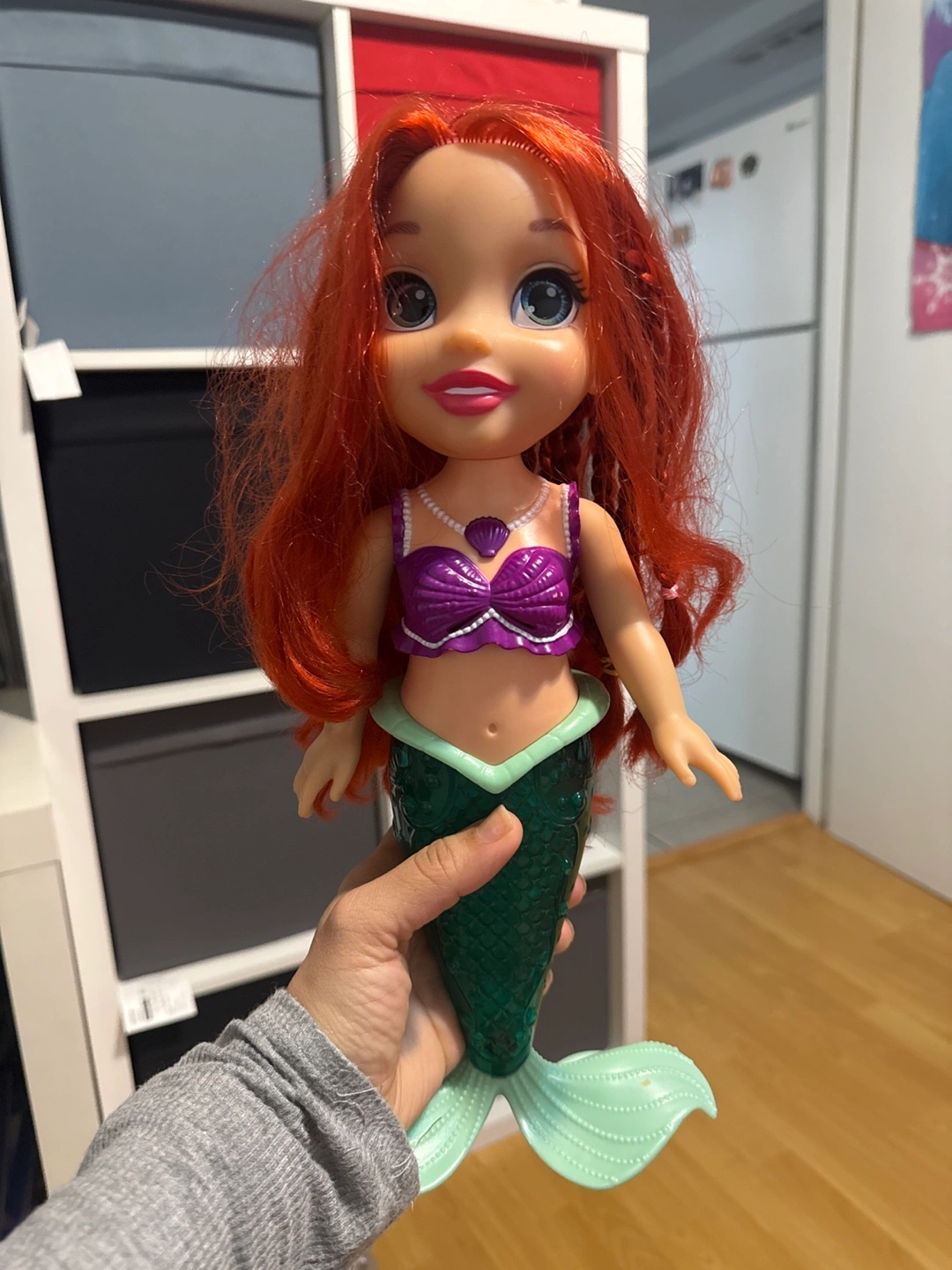 Adorable Disney Ariel doll. Long red hair, purple seashell top, and teal mermaid tail. Perfect for imaginative play.