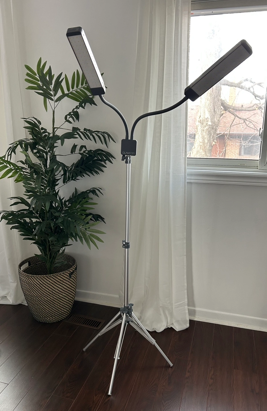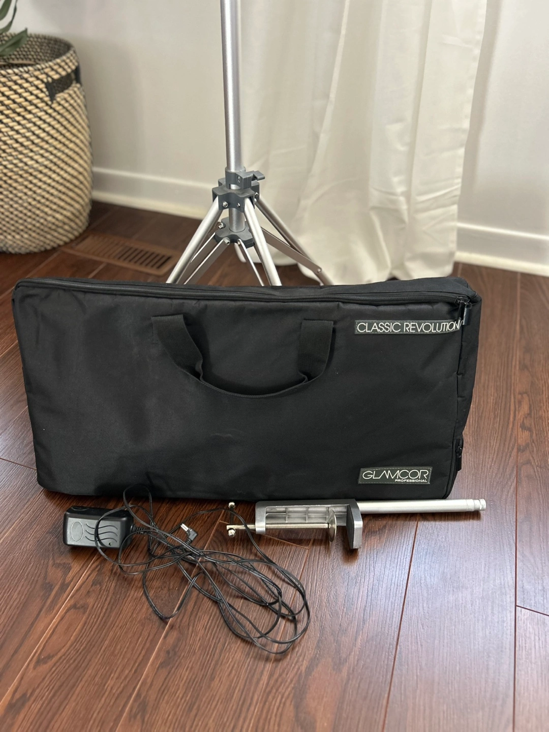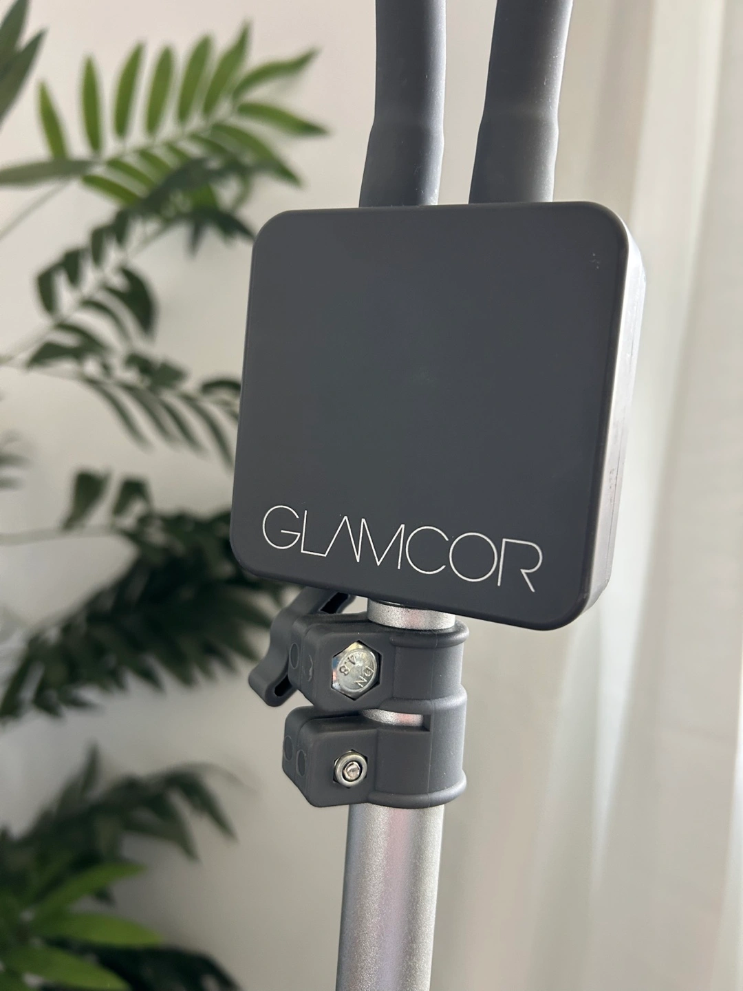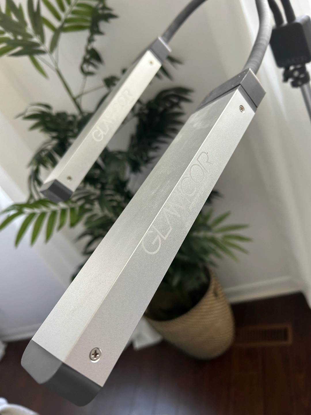 GLAMCOR is a LED lamp with two flexible arms of different lengths, designed to bend across wide. The updated arm design makes it easier to configure your lighting angles to better reach your treatment areas. No more awkward angles or shadows. It also generates nearly zero heat so you can light up you (or your client's) face without discomfort. No more sweating!