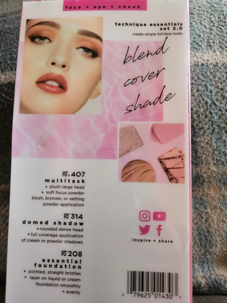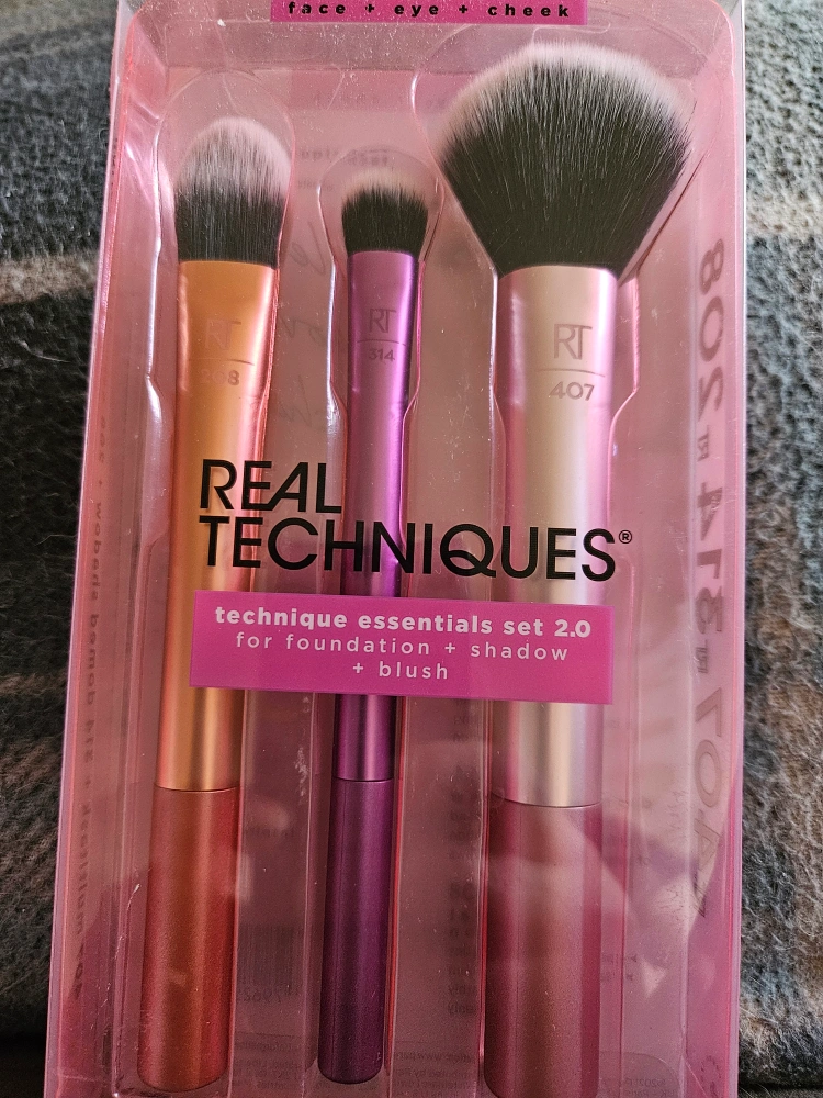 New, sealed Real Techniques brush set. Includes three brushes: multitask, domed shadow, and essential foundation. Perfect for foundation, blush, and shadow application.