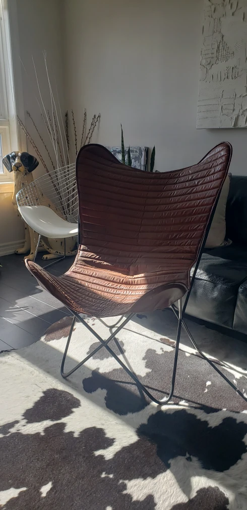 Stylish brown leather butterfly chair. Metal frame. Comfortable seating. Great accent piece for any room.