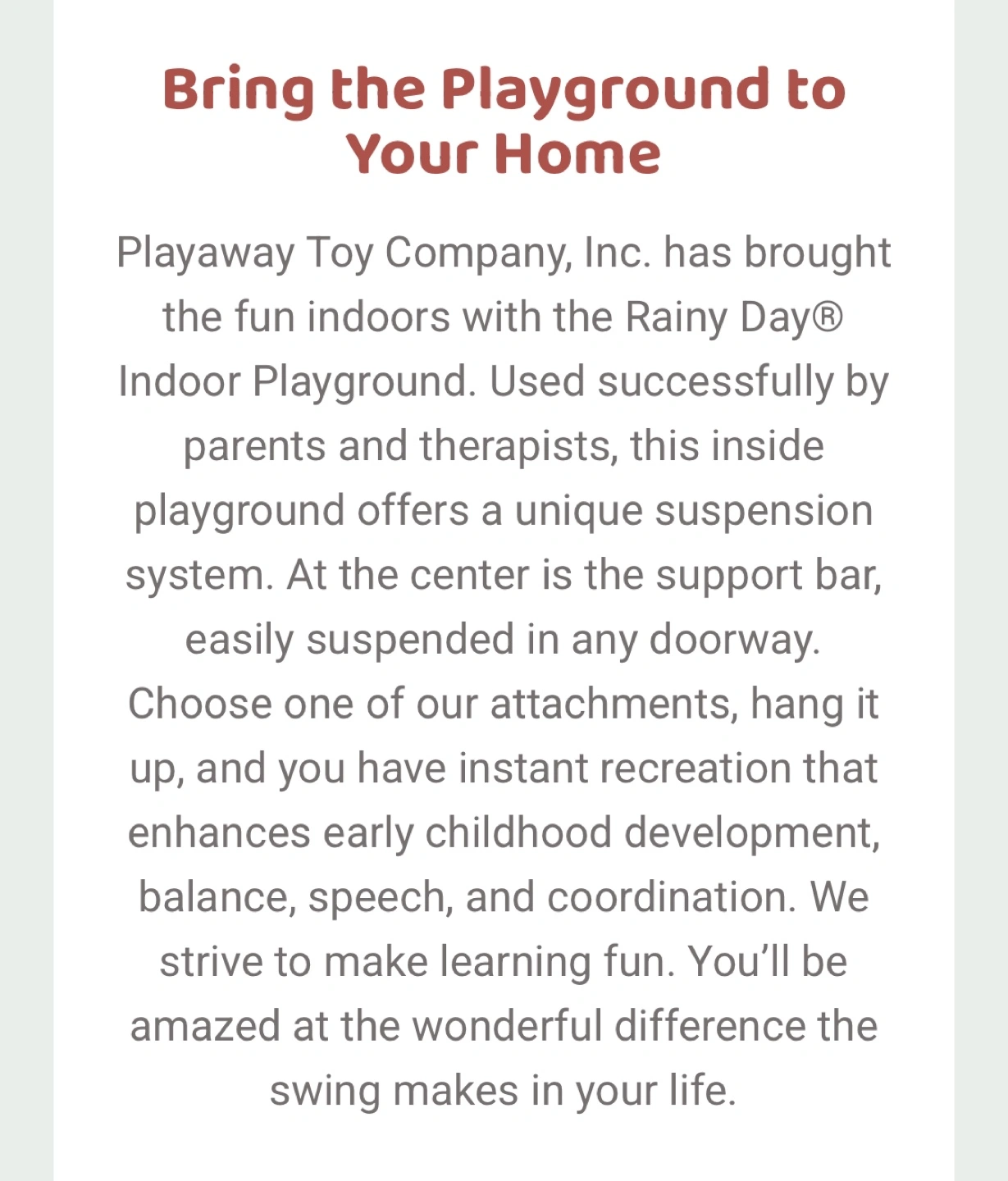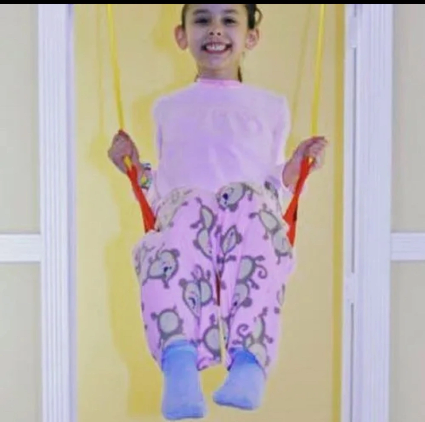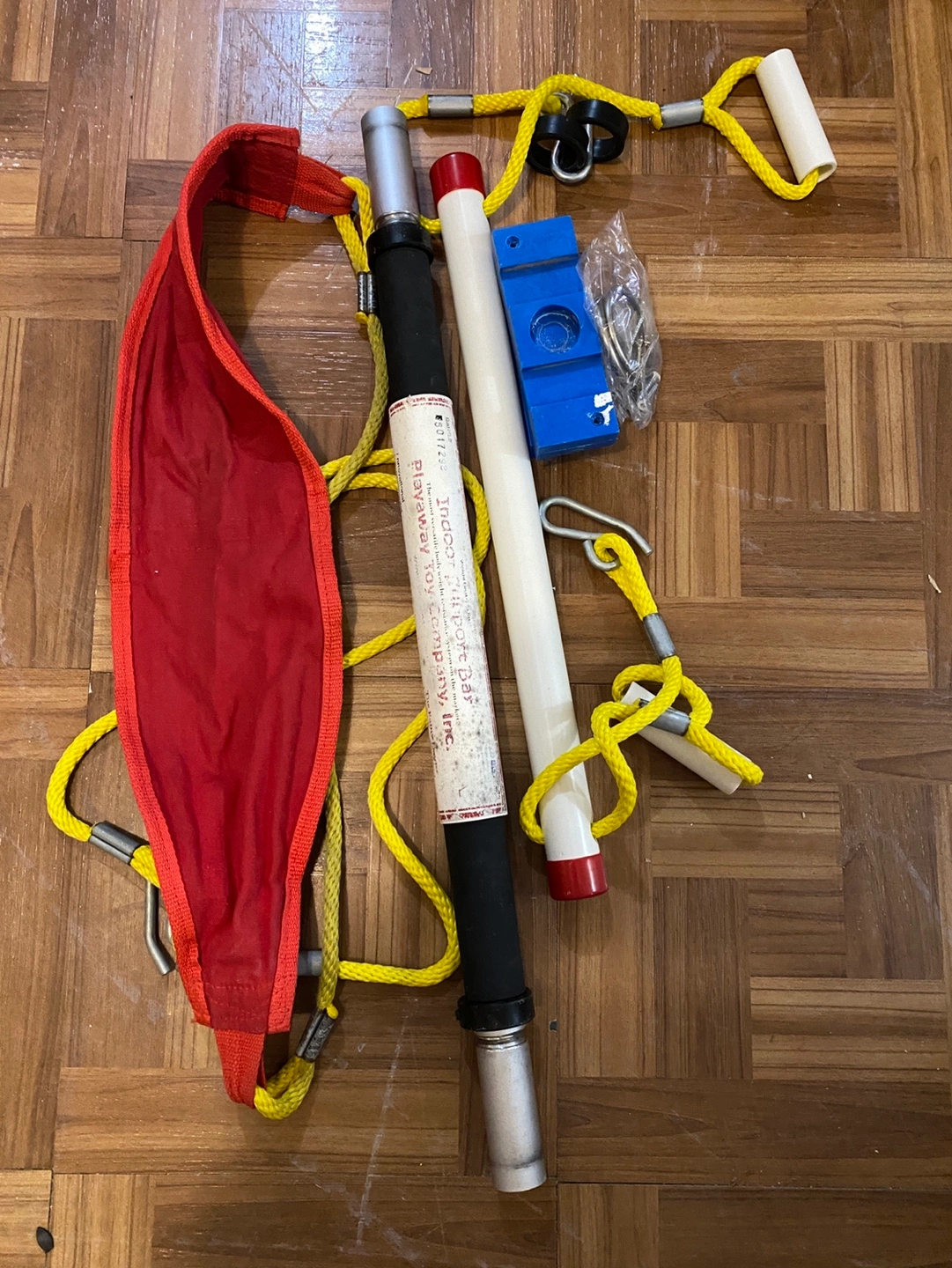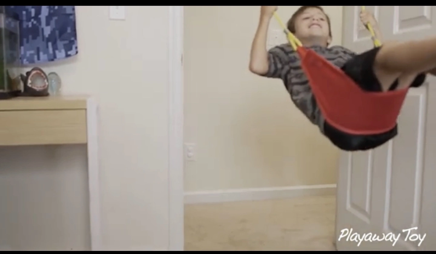 Indoor swing set. Includes red fabric swing and trapeze bar for children. Attaches to door frame. Great for kids, use with supervision! Fun and engaging.