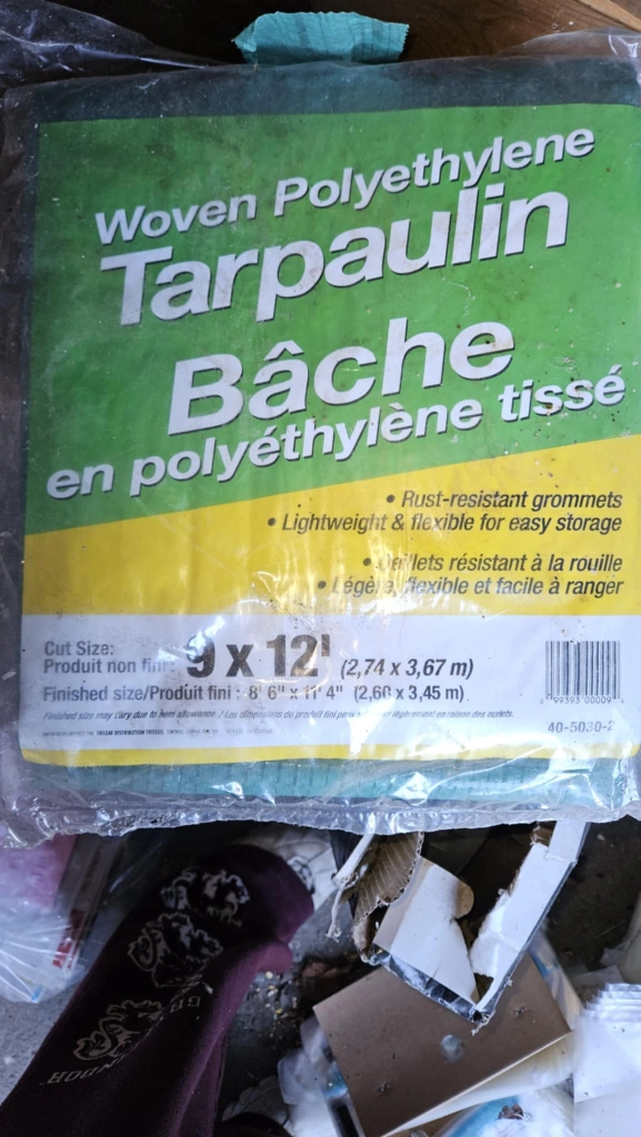New, unused woven polyethylene tarp. Lightweight and flexible for easy storage. Rust-resistant grommets. Cut size 9x12 feet, finished size 8'6"x11'4".