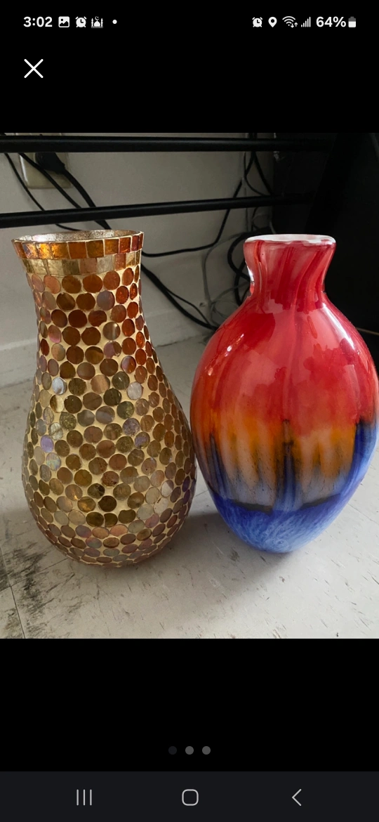 Set of two beautiful glass vases. One features a mosaic tile design in gold and amber tones. The other boasts a vibrant red, orange, and blue gradient.