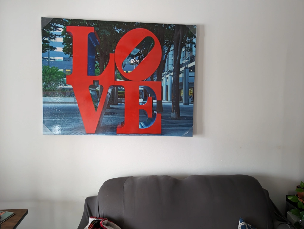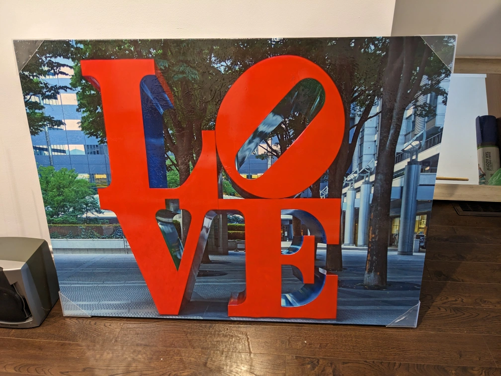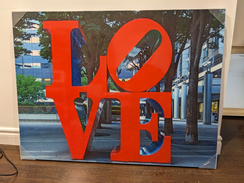 Large Canvas features "LOVE" in red. City backdrop. Perfect for decorating your room or condo. Excellent condition. Canvas Size: 48" x 36.5" I can deliver for an extra $10 (within GTA)