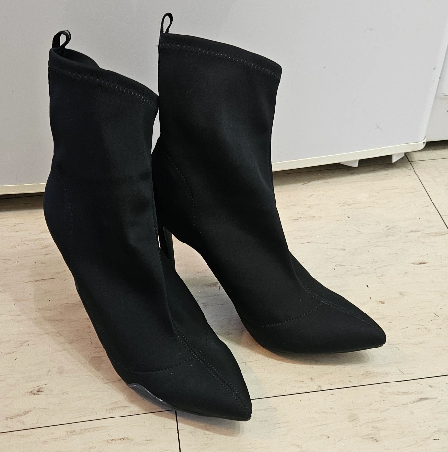 Women's black sock booties. Pointed toe and stiletto heel. Stretchy material. Comfortable and stylish.