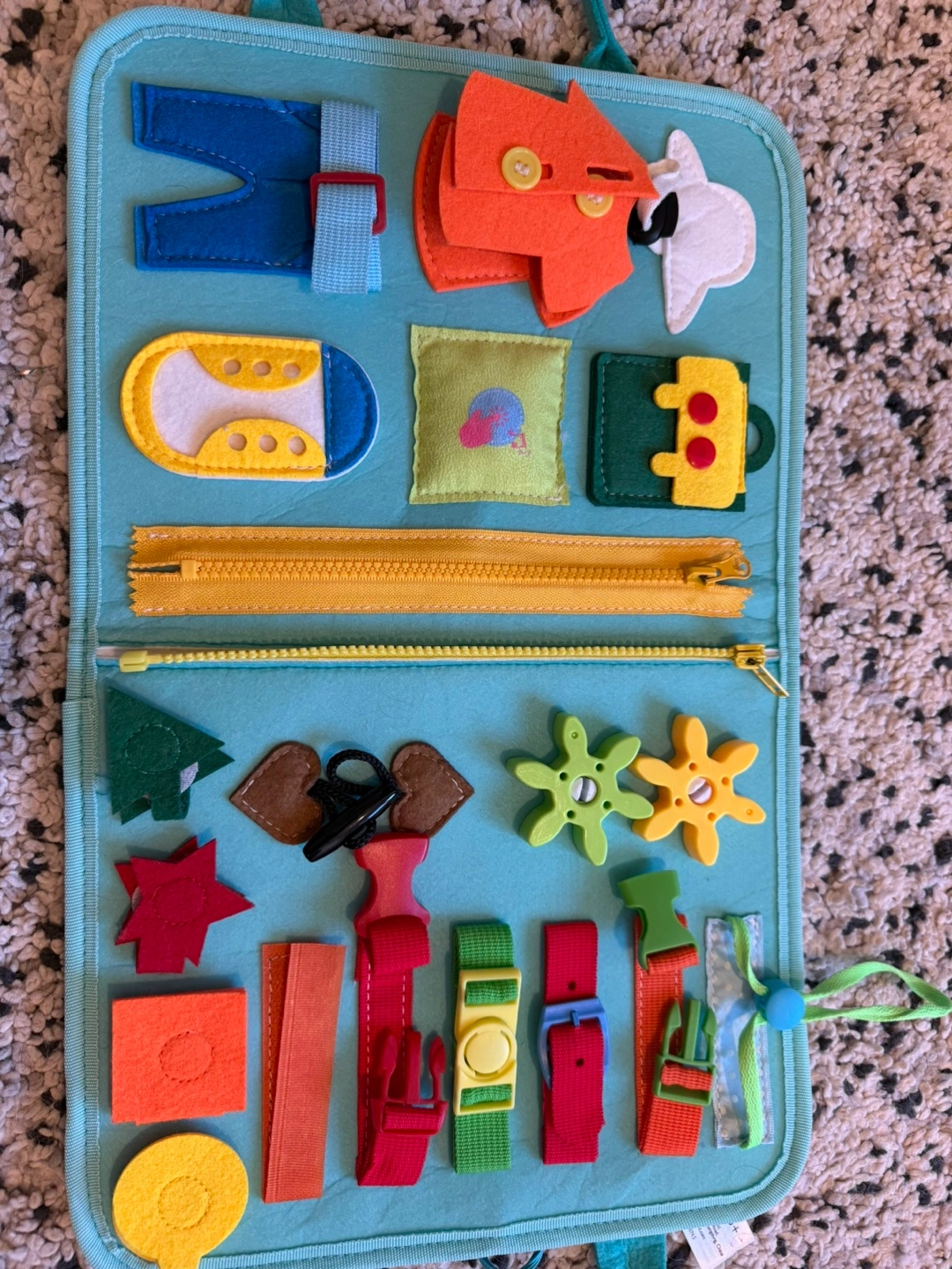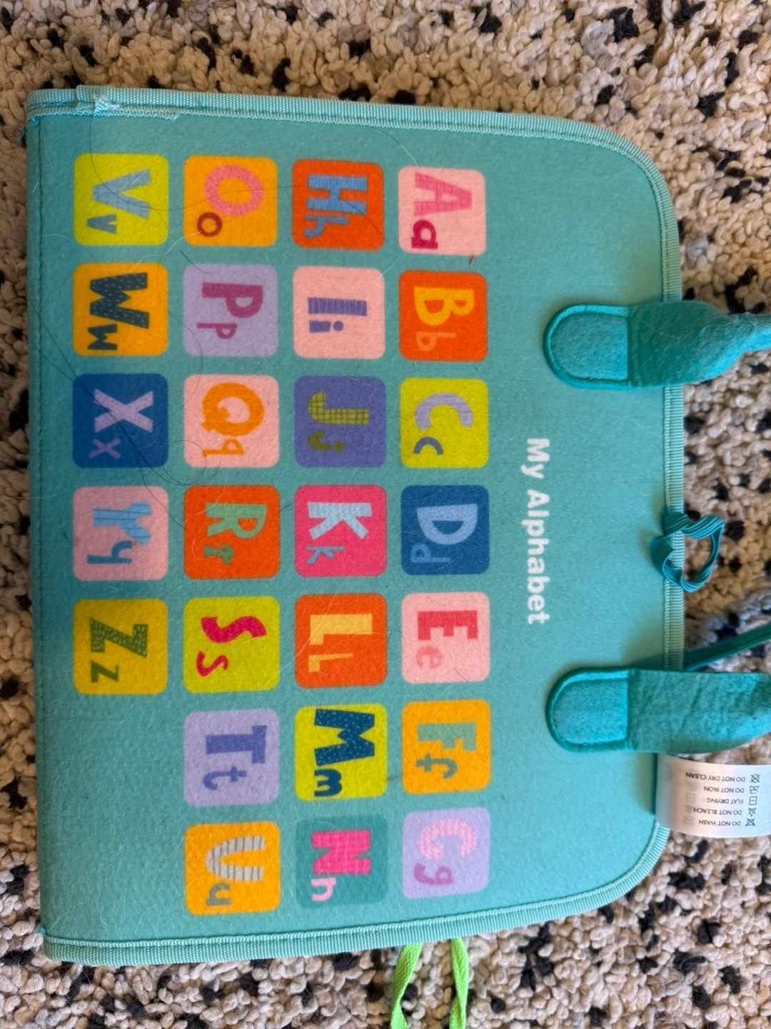 1000+Quiet book for toddlers. Features alphabet, farm animals, and clothing. Great for travel. Soft fabric.