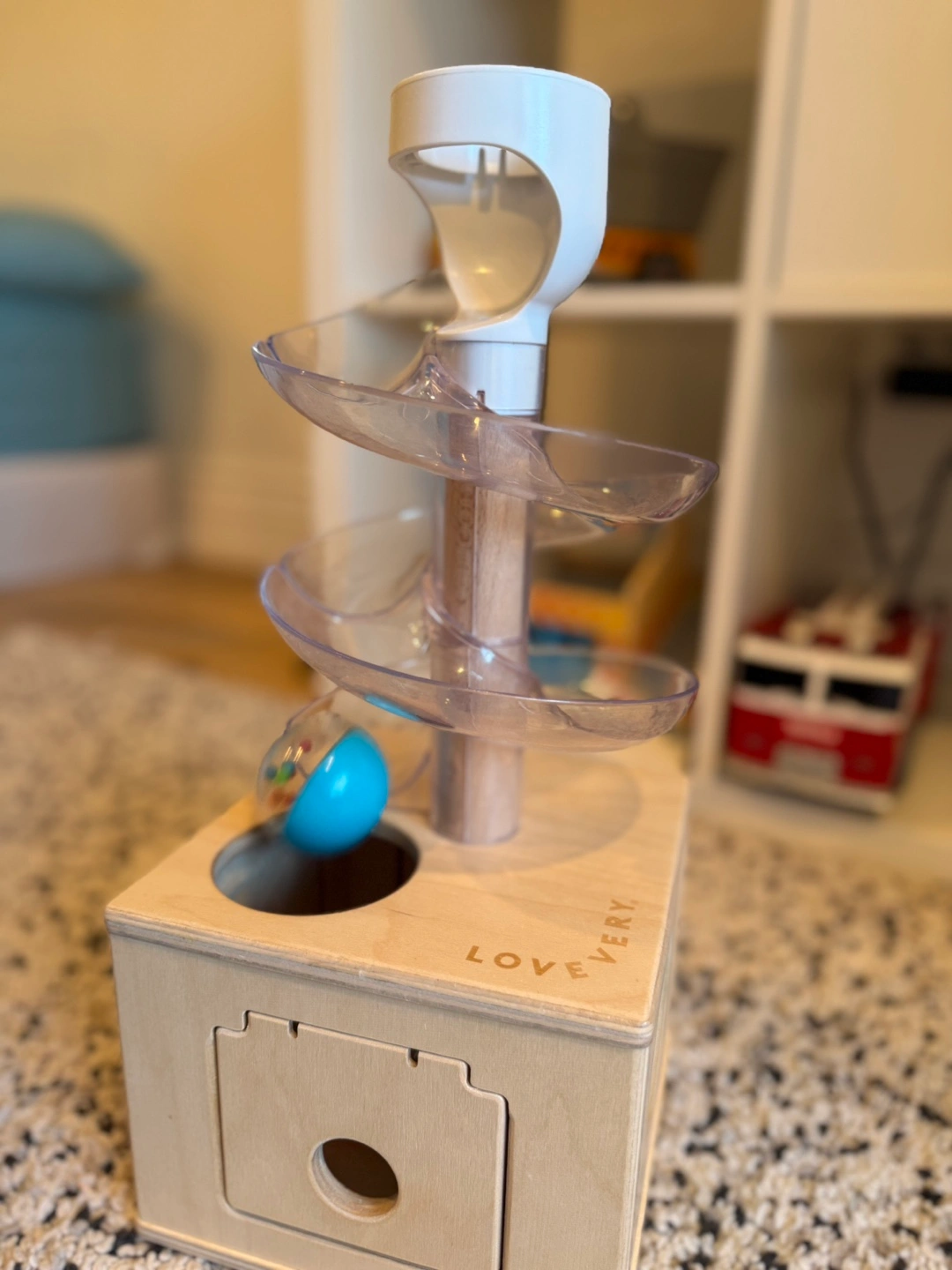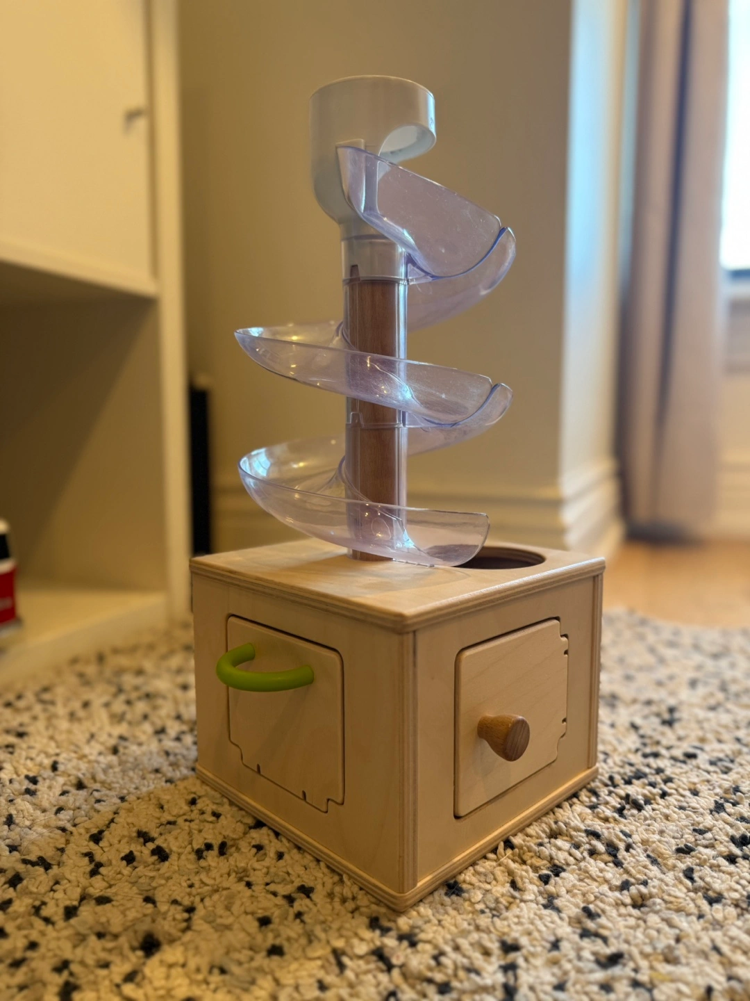 Wooden block toy. Features a spiral ball run. Includes a small drawer and a chute for balls. Great for toddlers.