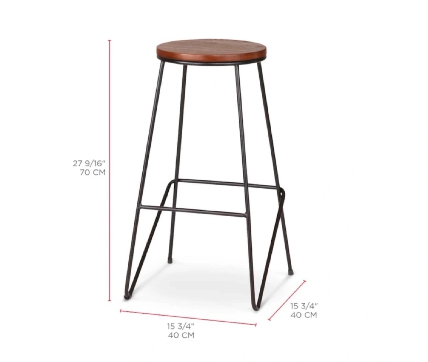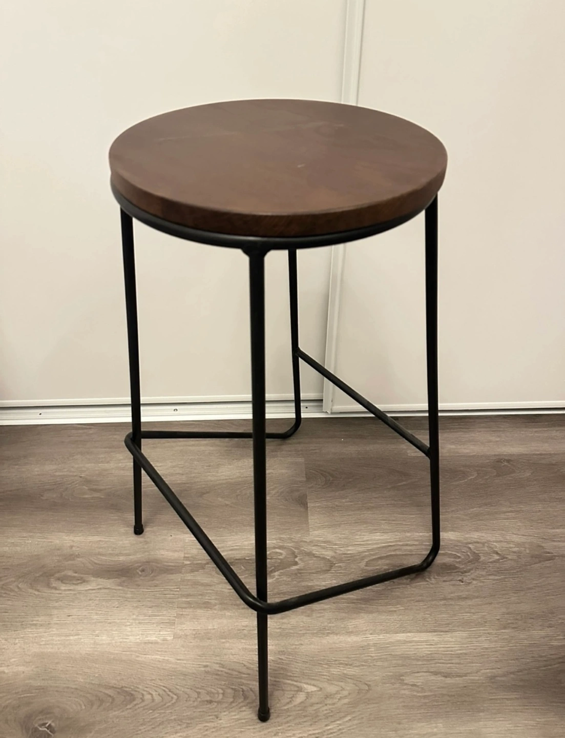 Dark brown wood top. Sleek black metal frame. Simple design. Perfect for a kitchen island or bar. Dimensions are in the last picture (15 3/4” W x 15 3/4” D x 27 9/16” H). In excellent condition.