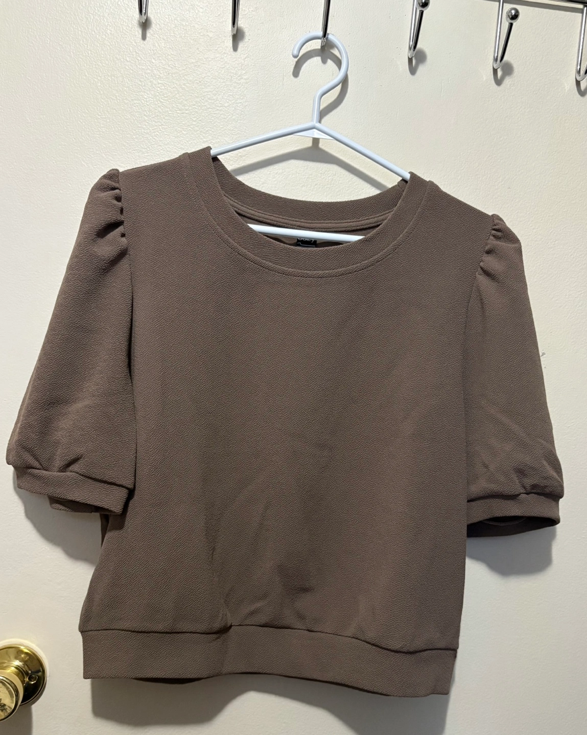 Women's mauve-brown puff-sleeve blouse. Size XL(Asian Size). Crew neck. Short sleeves.