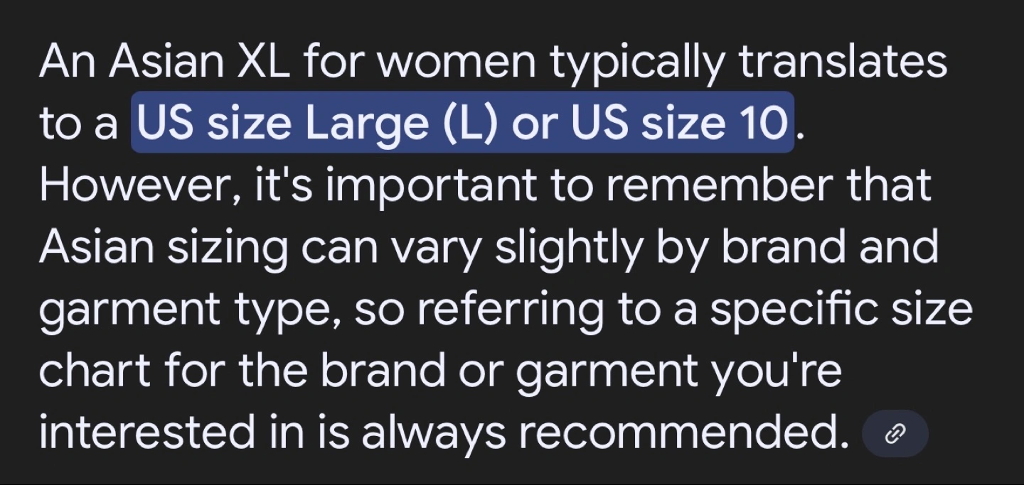 An Asian size XL generally corresponds to a US size Large (L). depending on the type of garment and brand.