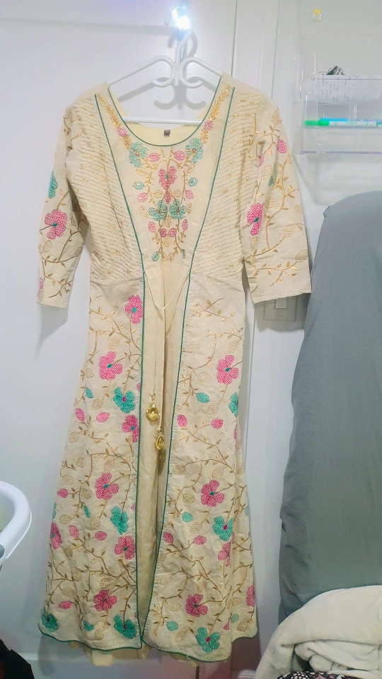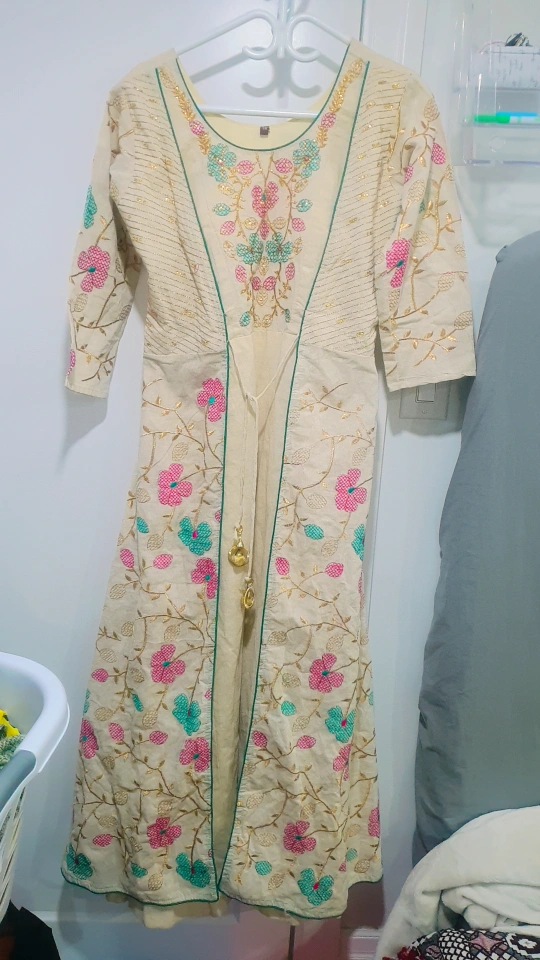 Elegant cream-coloured hand work gown. Features intricate embroidery with pink, teal and gold accents. Three-quarter sleeves. Front slit with a tassel. Beautiful for special occasions.