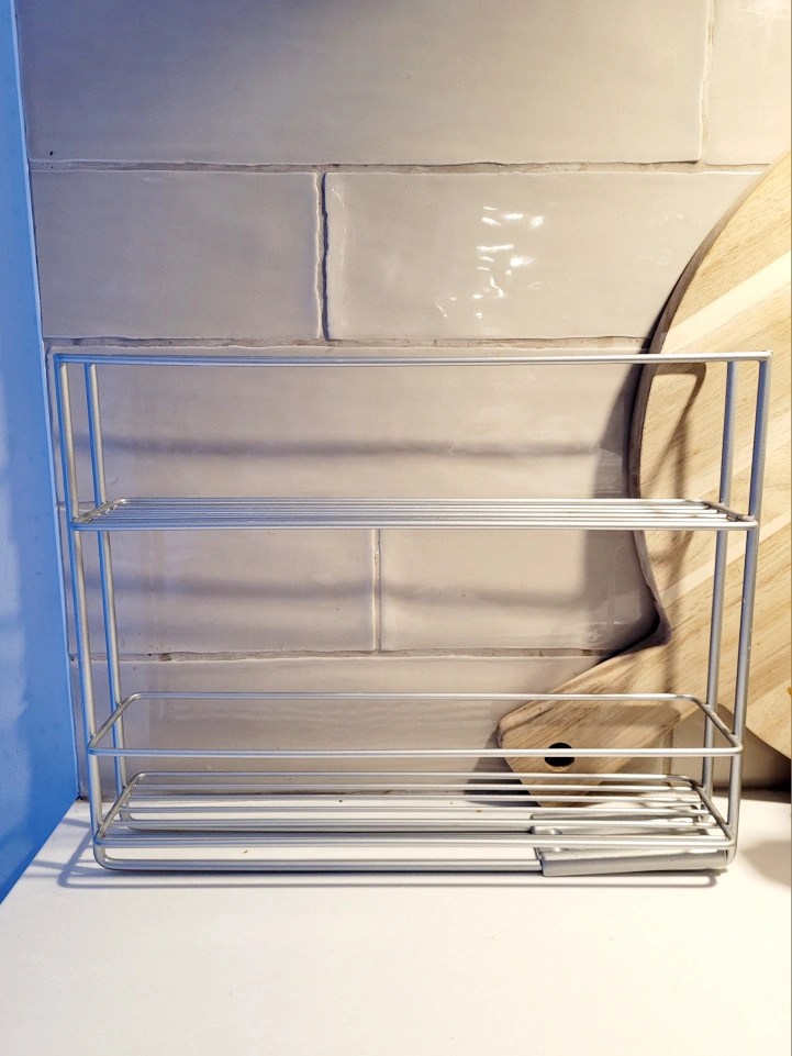 Two-tiered spice rack. Silver metal frame. Organize your spices and condiments. Compact design. Great for small kitchens. Needs double sided tape to install. Once installed, it can slide in and out of the cabinet.