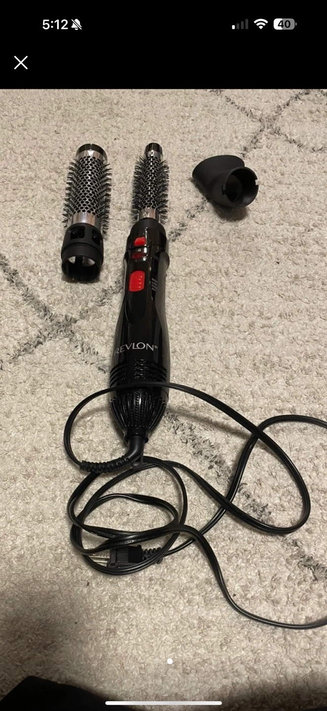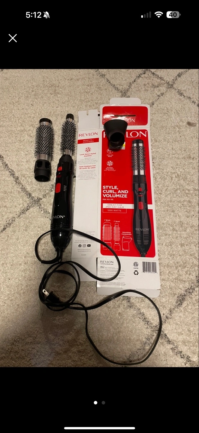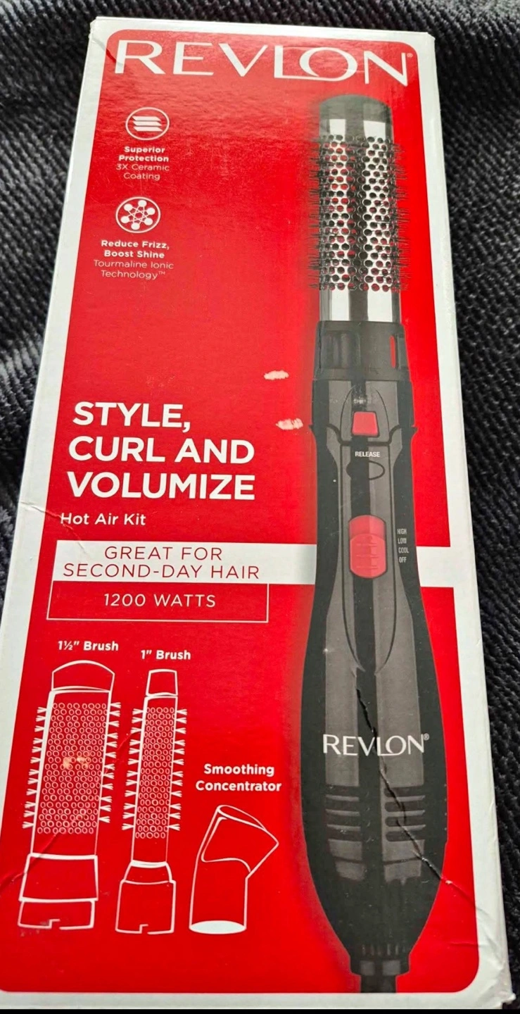 Revlon volumizing hot air kit. Includes two brushes and concentrator. 1200 watts. Great for second-day hair. Tourmaline ionic technology. Reduce frizz.